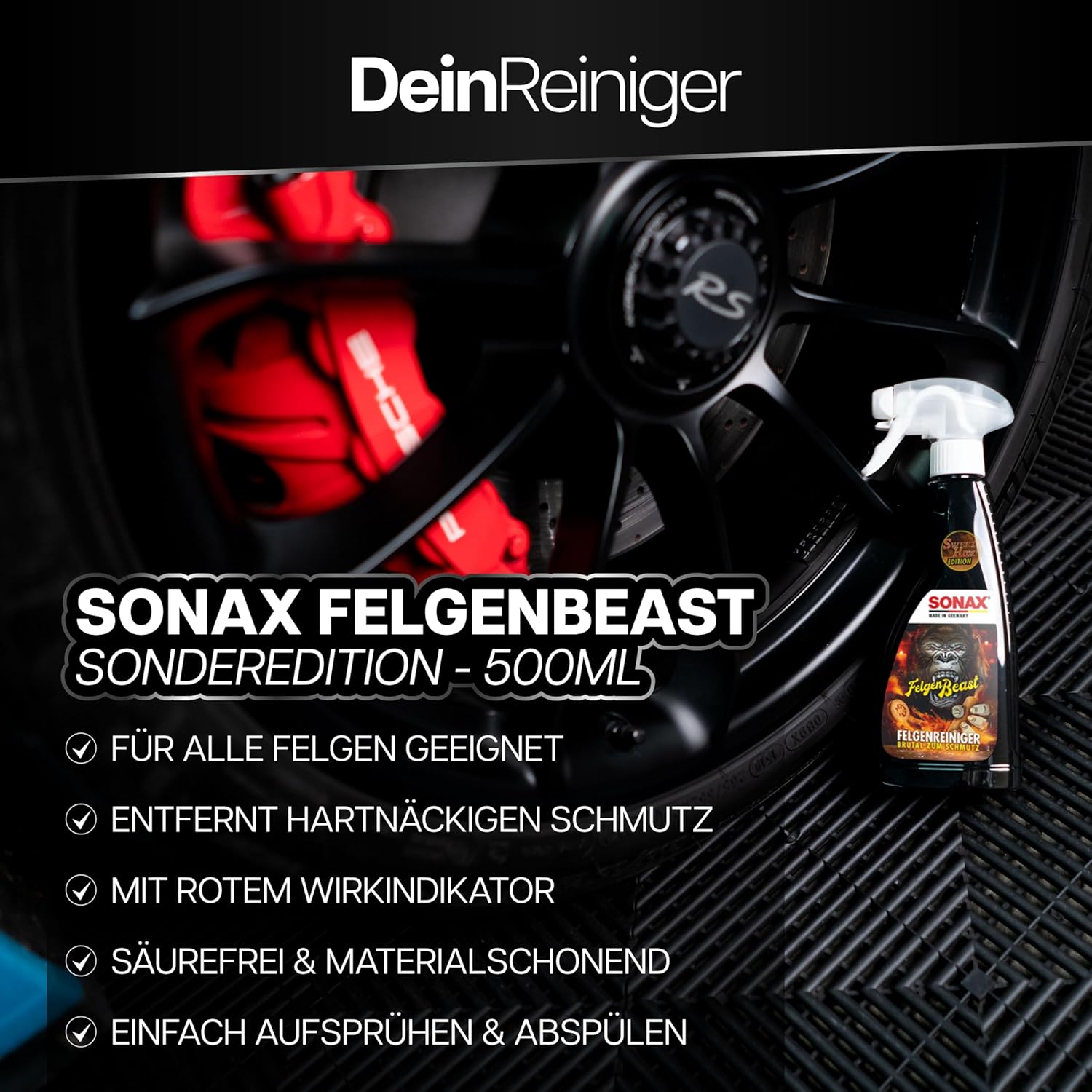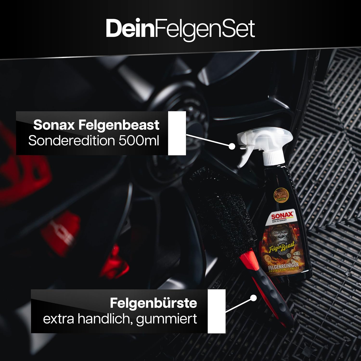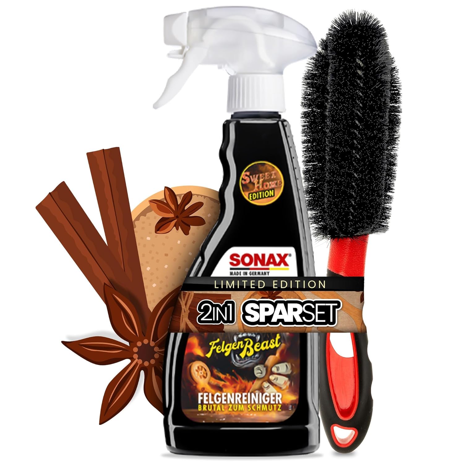 Комплект за почистване на джанти | Sonax Rim Beast Rim Cleaner Special Edition 500 мл + четка за джанти | Комплект за почистване на алуминиеви джанти с четка за ефикасна грижа за автомобилни джанти