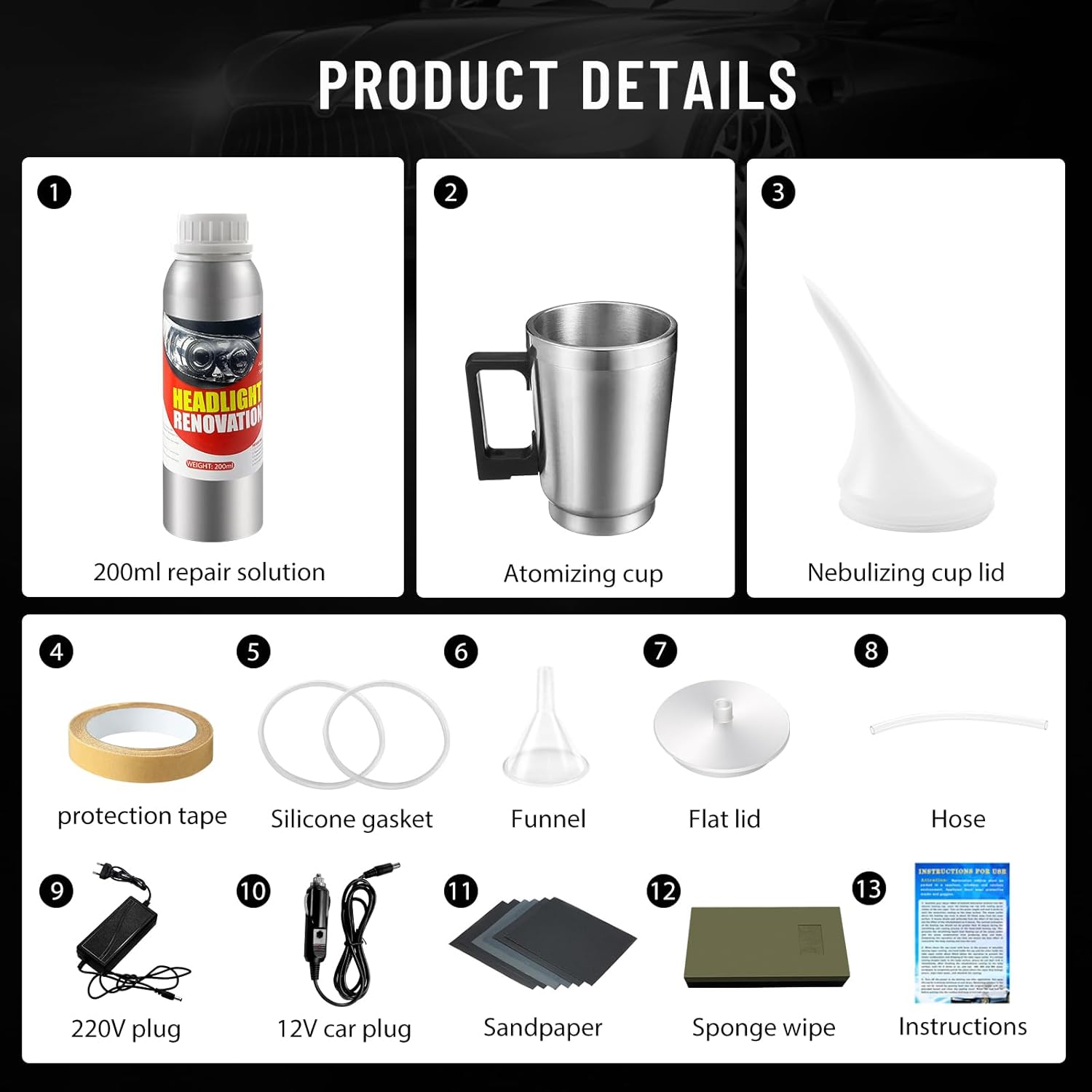 • Пълни аксесоари: комплектът за подготовка на фарове съдържа 200 мл течност за ремонт, чаша за пулверизатор, 6 броя шкурка, два захранващи източника, капак за чаша, фуния, уплътнителен пръстен, защитна лента, гъбена дъска