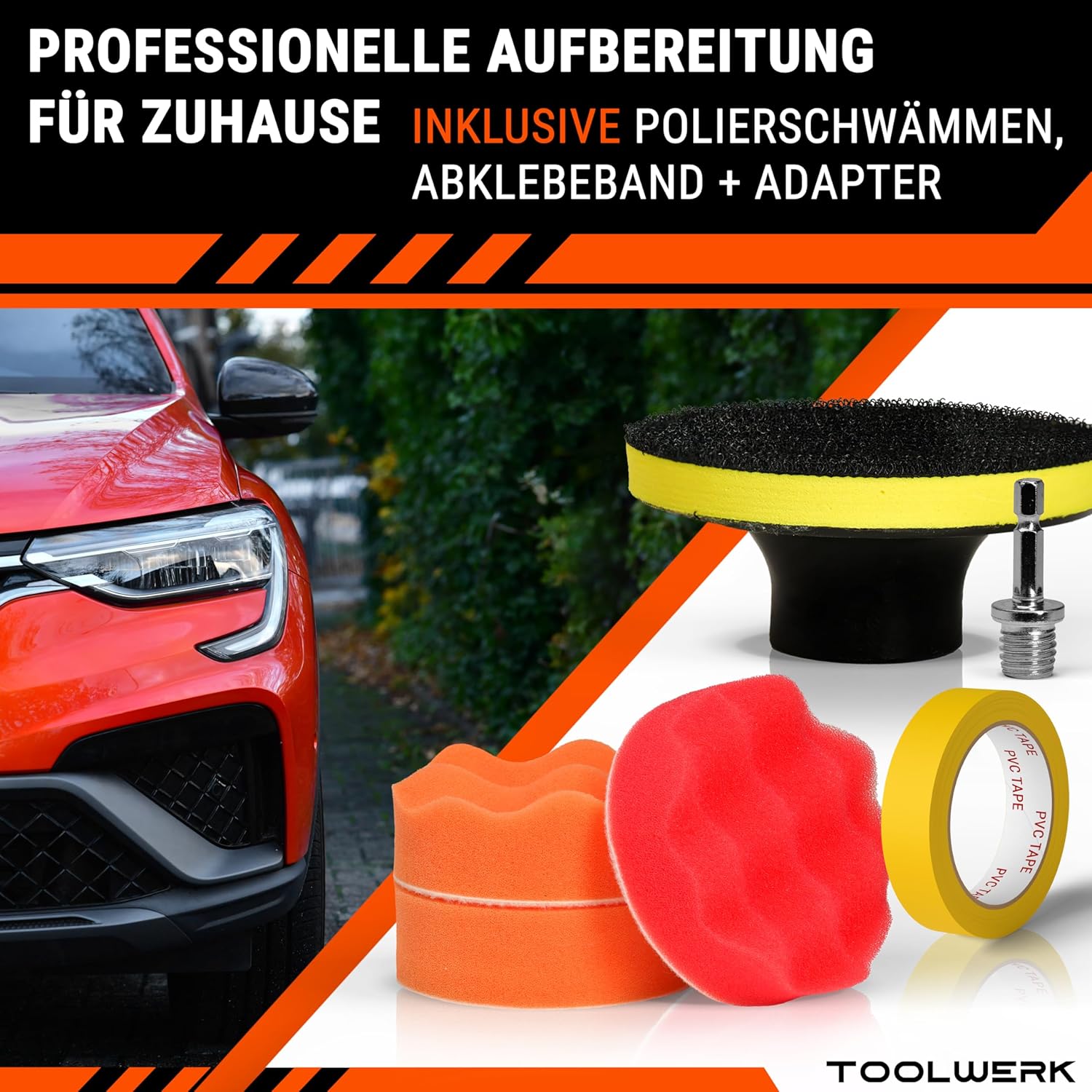 • Комплект „всичко в едно“ – комплектът за обработка TOOLWERK съдържа всичко необходимо за реставрация на фарове: UV и полираща паста, глава за тапицерия, шкурка, приставки, памучни тампони, лента и адаптер!