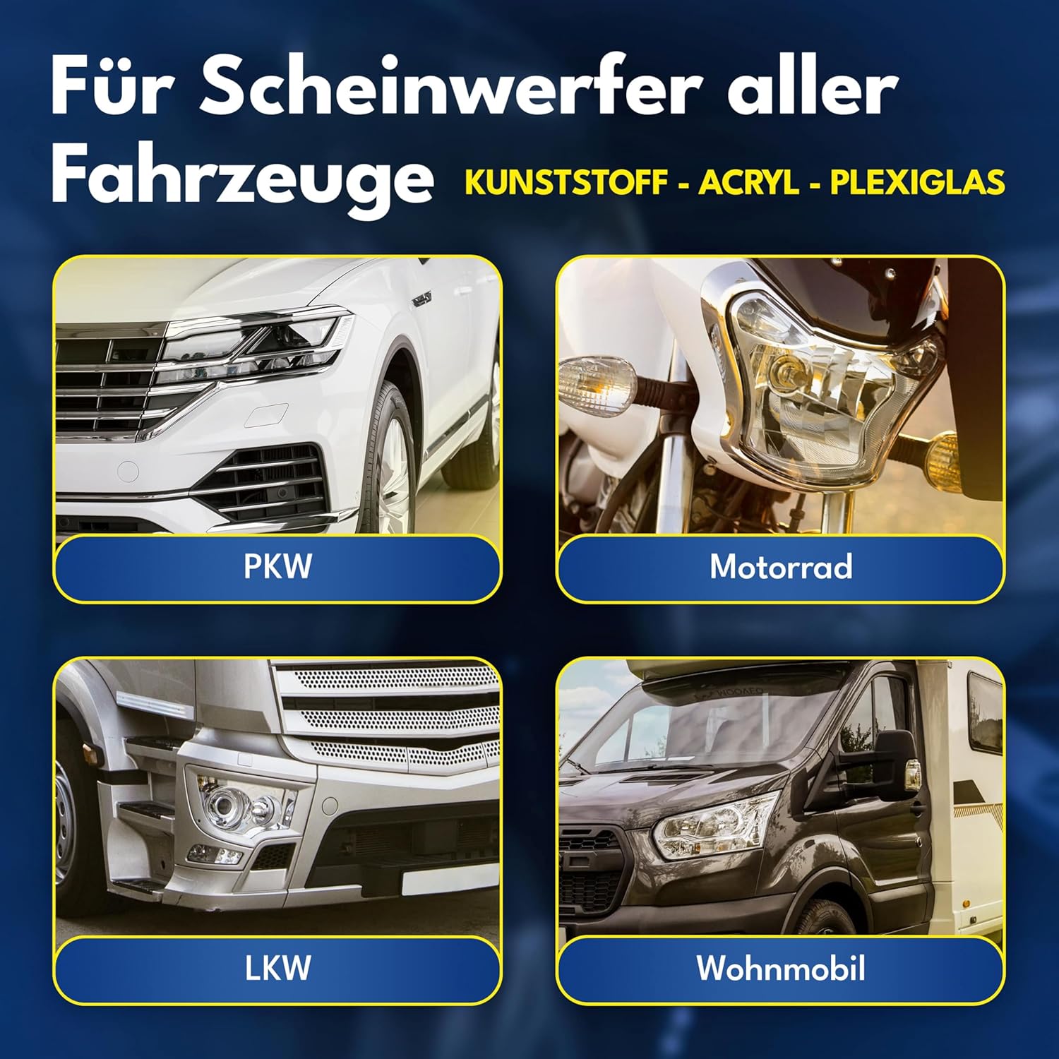 • За всички превозни средства: Комплектът за подготовка на фарове на ATG може да се използва за всяко превозно средство. Фаровете на камиони, кемпери и автомобили са като нови с нашата паста за полиране на фарове.
