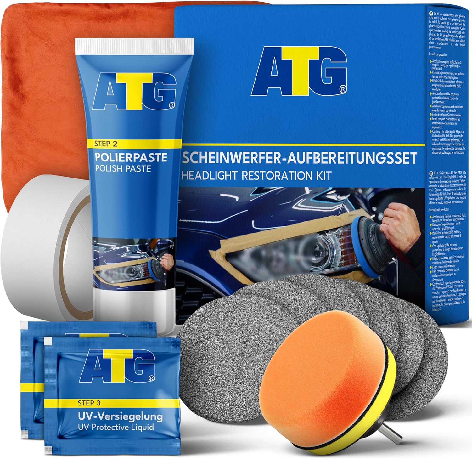 Комплект за подготовка на фарове ATG®, Универсален комплект за полиране на автомобилни фарове за матови и слепи фарове, изработени от пластмаса, Бърза и лесна подготовка на фарове, Комплект за ремонт на фарове