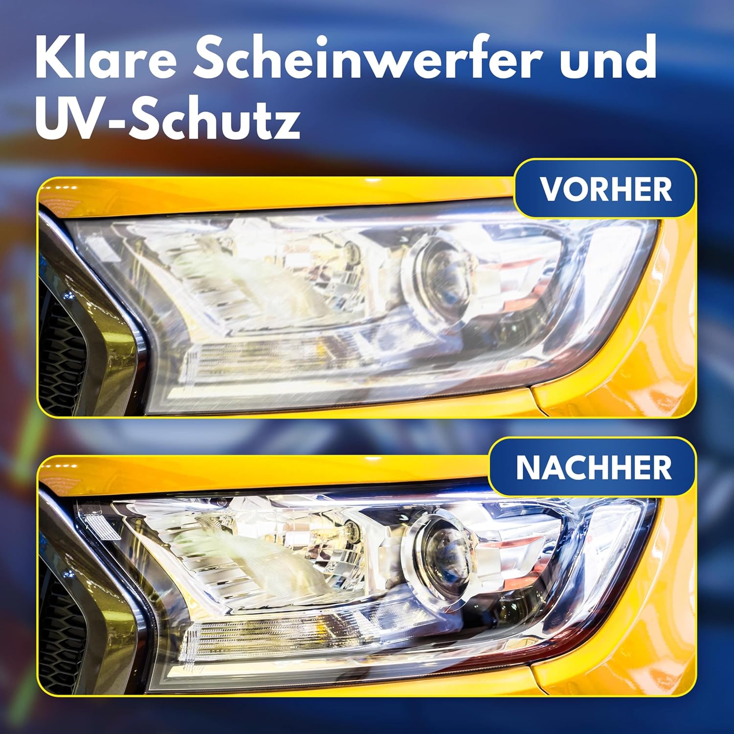 • 100% ясна видимост: с нашия комплект за полиране на фарове на автомобили, матовите и слепи фарове могат да бъдат полирани и запечатани. Това осигурява значително по-голяма яркост и следователно по-голяма безопасност при движение по пътищата.