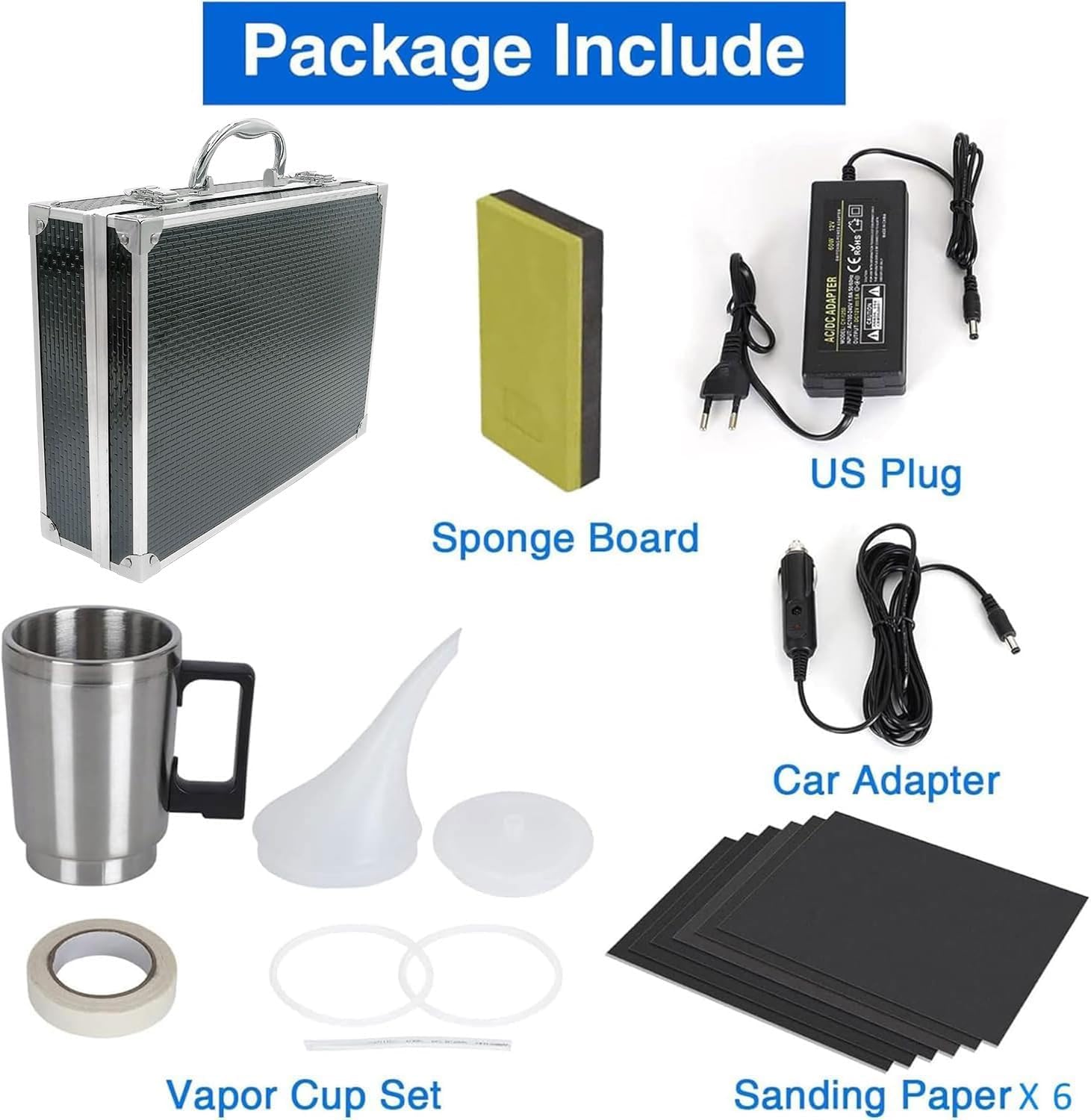 • Пълни аксесоари: 220V домакински кабел, 1 метър автомобилен кабел, капак за фуния, плоска капачка + маркуч, уплътнителни пръстени x2, шкурка x6, шкурка, текстурирана хартия, картон. Моля, обърнете внимание, че ремонтната течност трябва да се закупи отделно, за да се гарантира пълната функционалност на комплекта.
