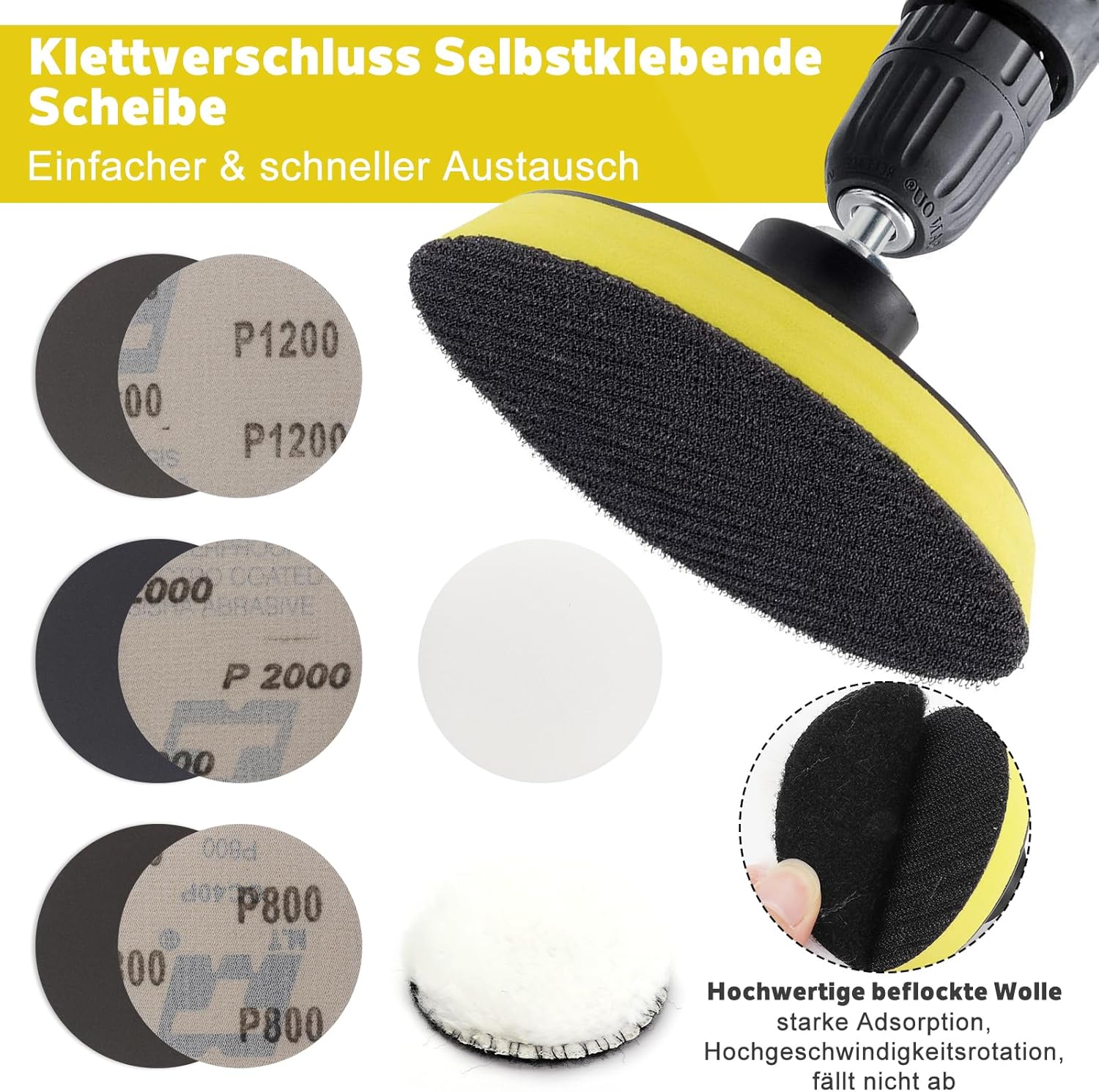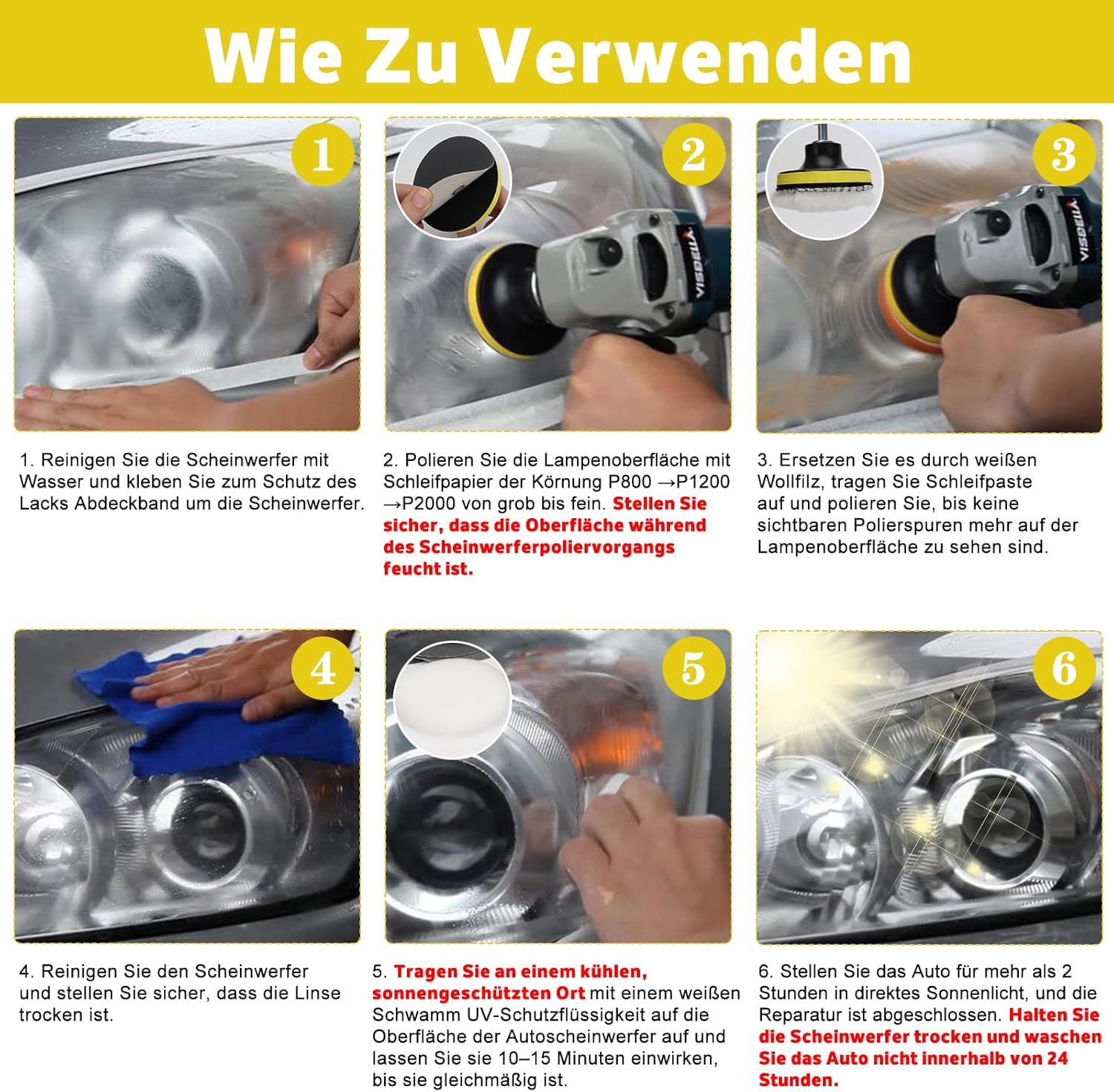 • Комплект за подготовка на фарове - Комплектът съдържа: 1 x 85 г абразивна паста, 1 x шлифовъчен диск, 1 x метален адаптер, 1 x маскираща лента, 1 x бяла гъба, 1 x вълнен филц, 2 x 3 мл UV защитна течност, 4 x шкурка P800, 4 x шкурка P1200, 4 x шкурка 2000, 1 чифт ръкавици, 1 x ръководство за употреба (английски език не е гарантиран). Пакетът за осветление на фарове е пълен и спестява време и пари.