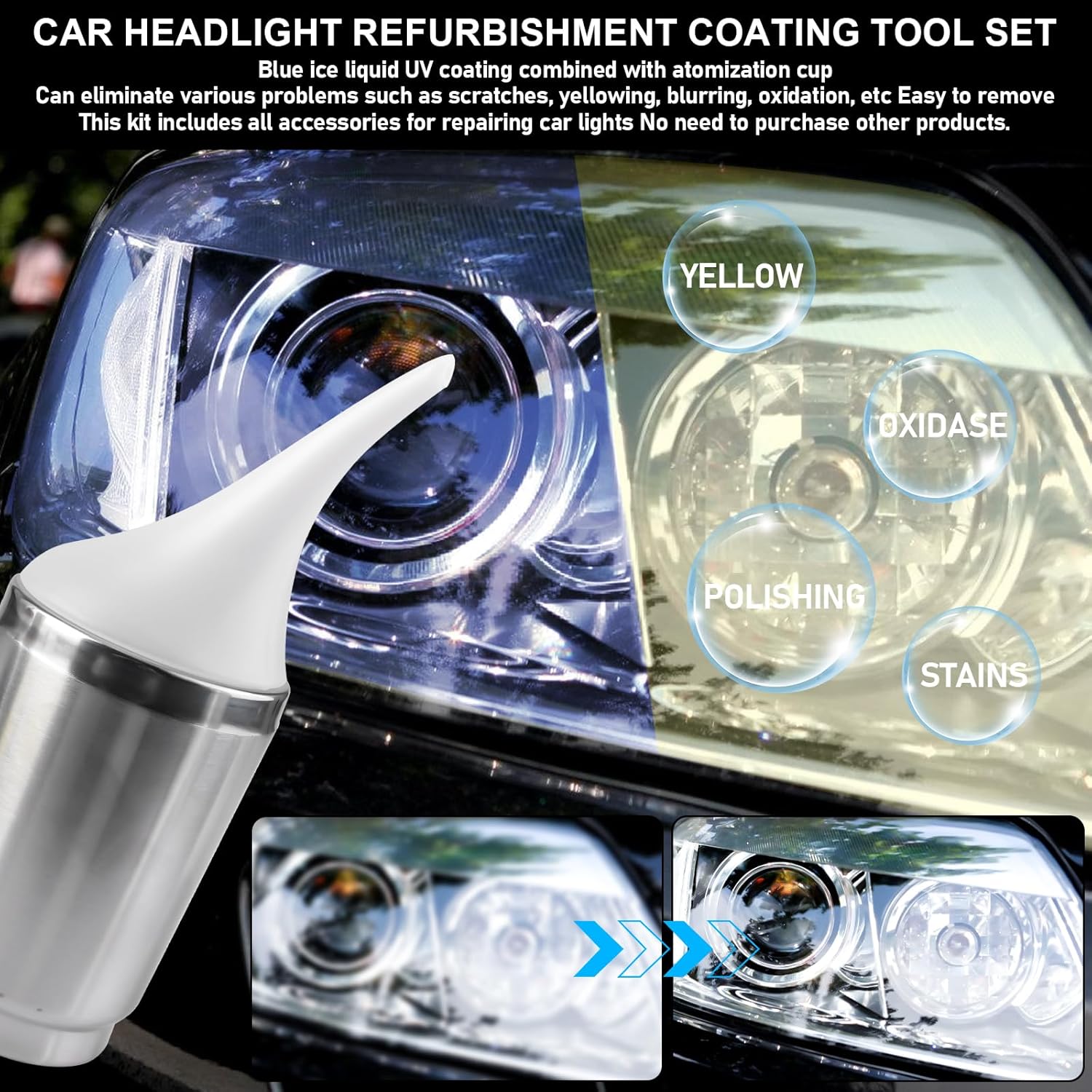 С комплект за ремонт на фарове, драскотини по автомобилните фарове могат да бъдат ефективно отстранени, като пожълтяване, замъгляване, окисляване, стареене и други проблеми.