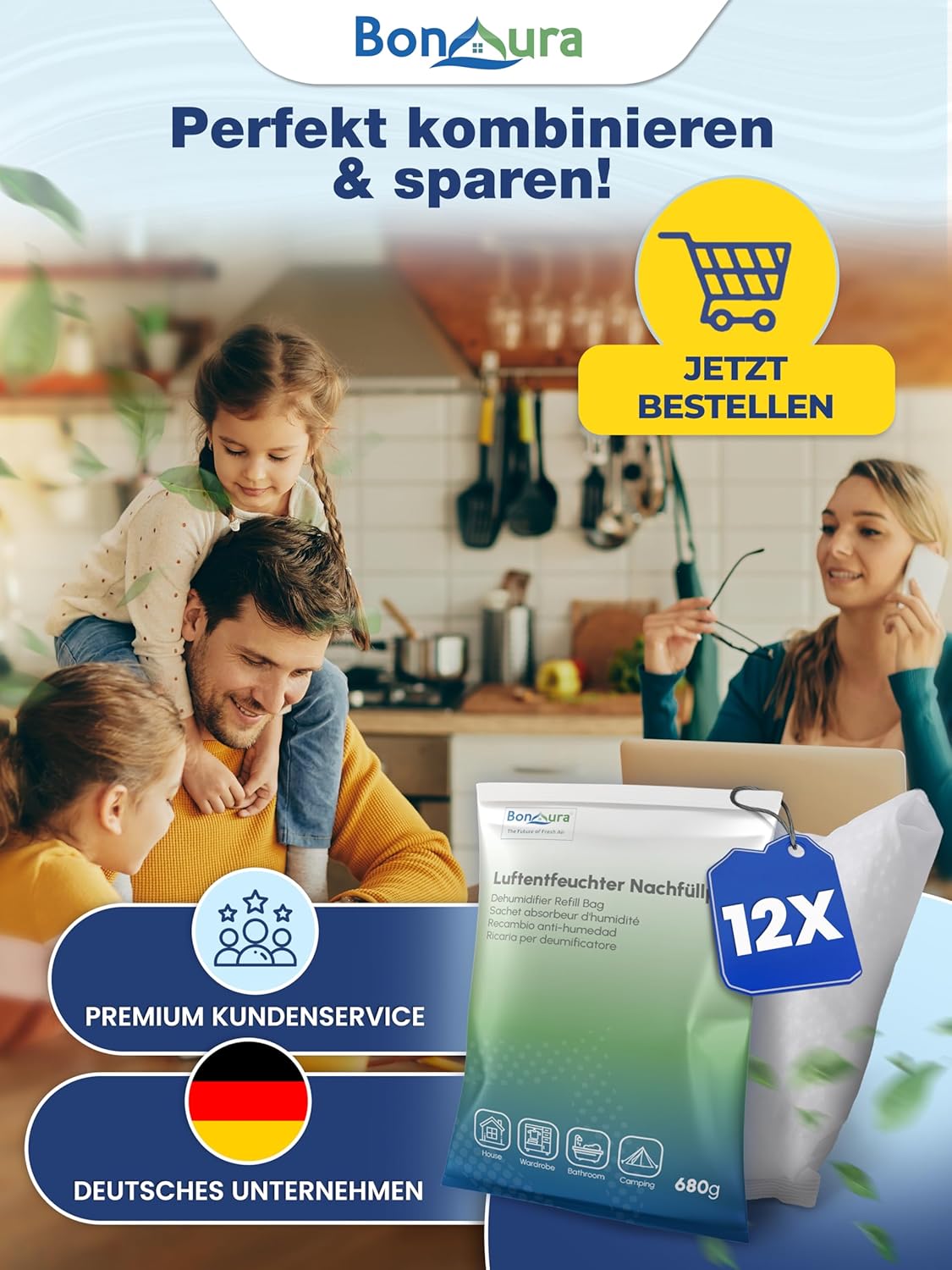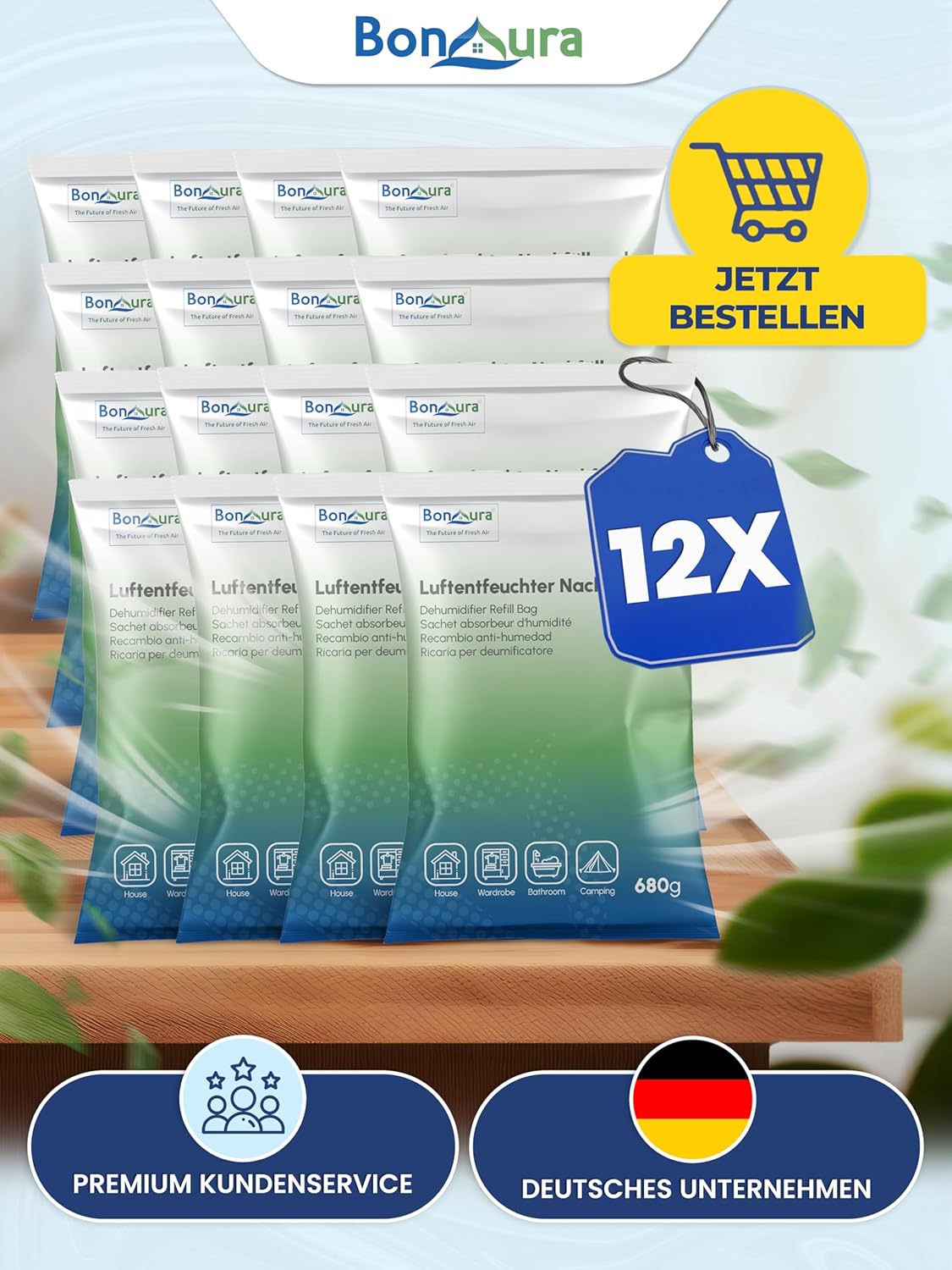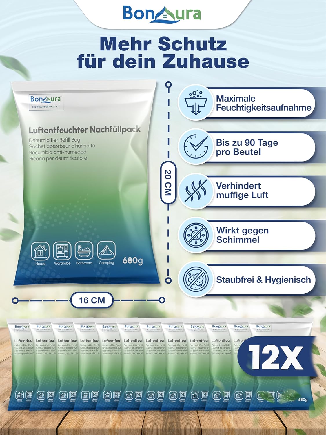 Комплект за пълнене на влагоабсорбатор BonAura 12 x 680 г – Икономичен комплект гранули за влагоабсорбатор – Комплект от 12 гранули за влагоабсорбатор – Защита от мухъл и миризма