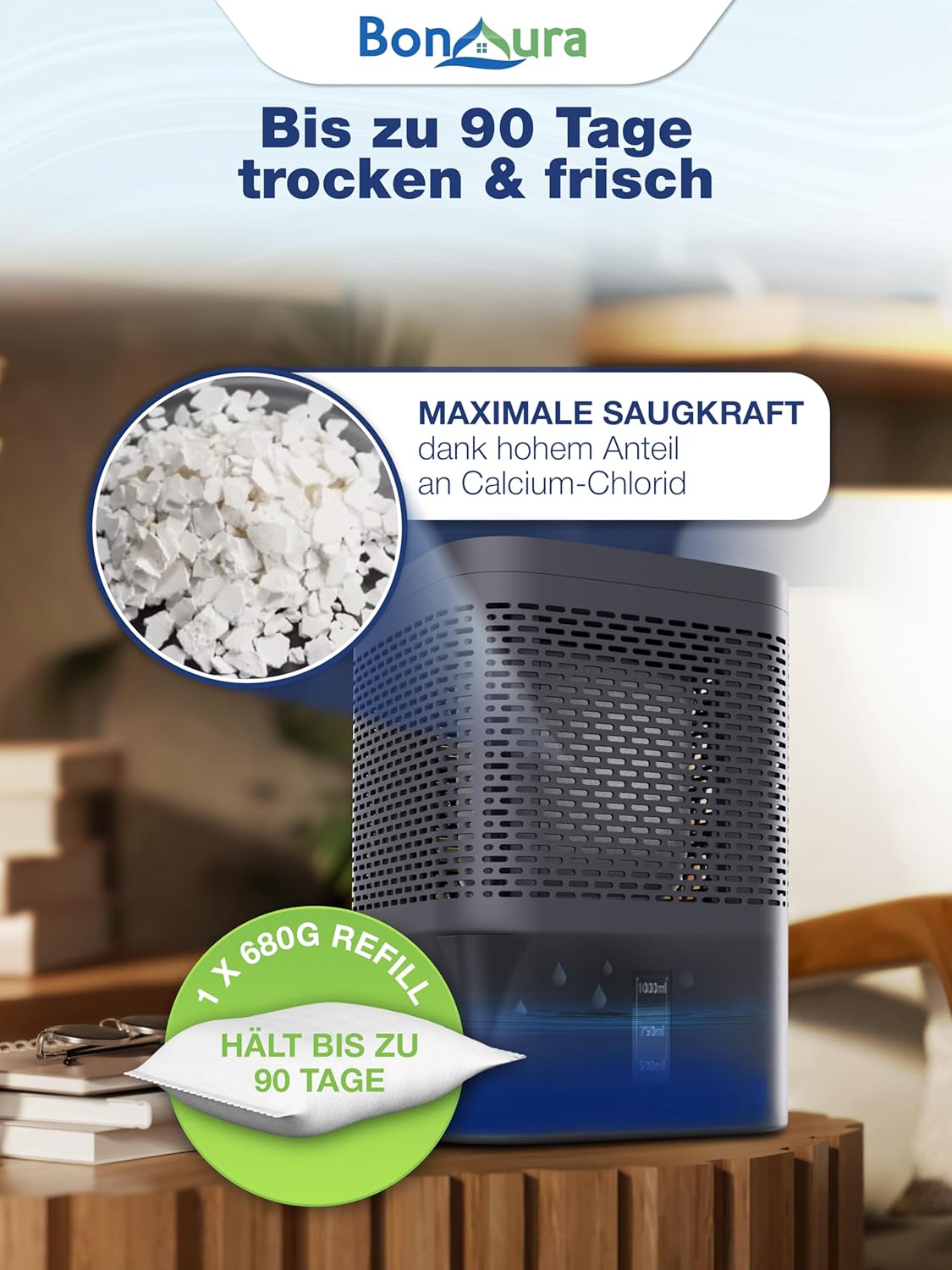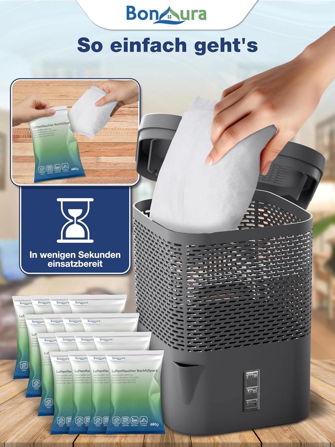• Ефективен срещу влага: този влагоабсорбатор BonAura е ефективен убиец на влага и ви помага оптимално при петна от мухъл, застояли миризми и конденз по прозорците.