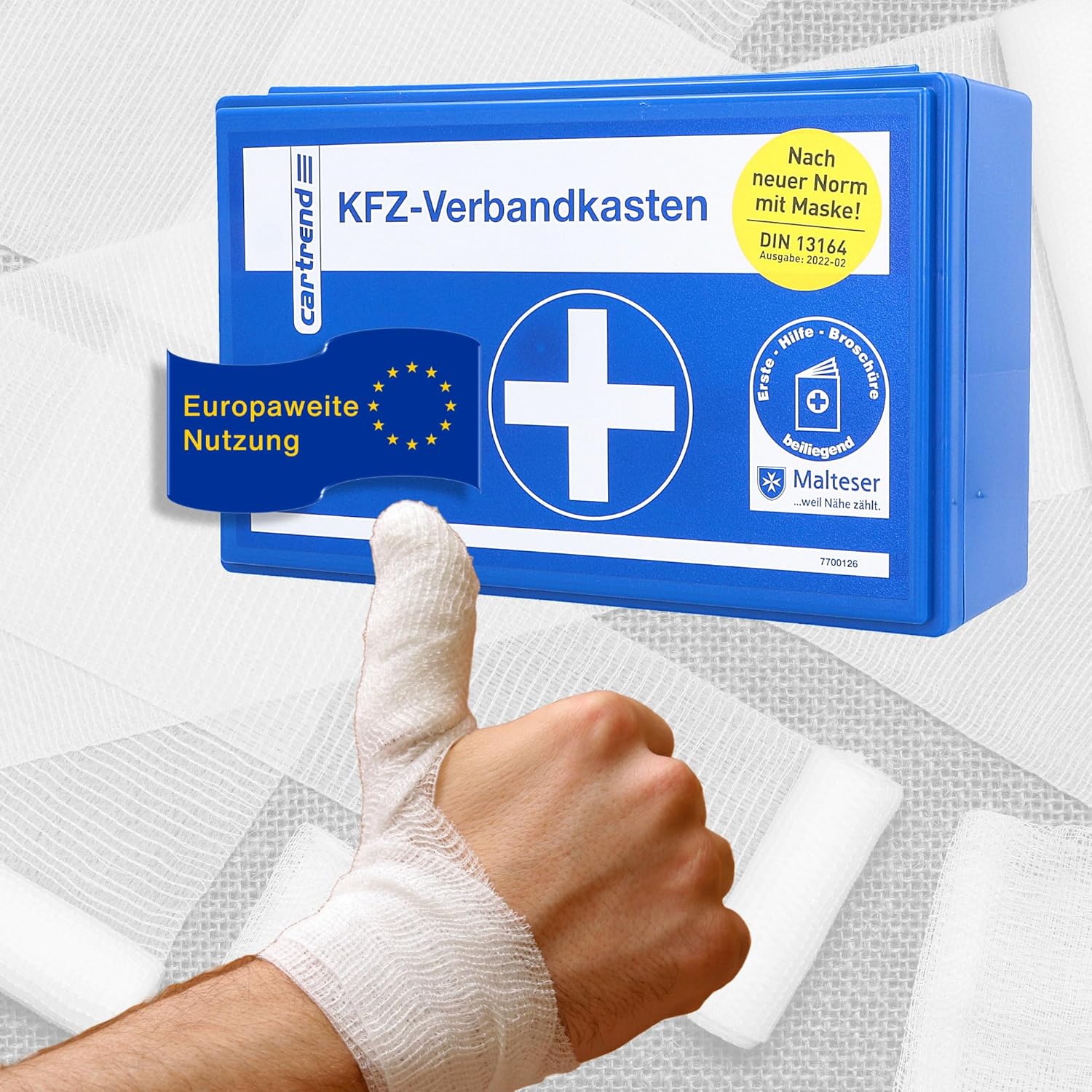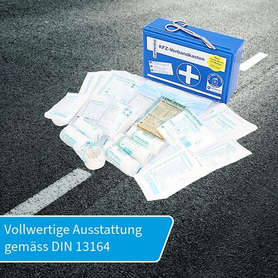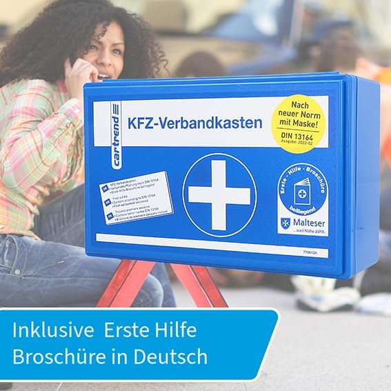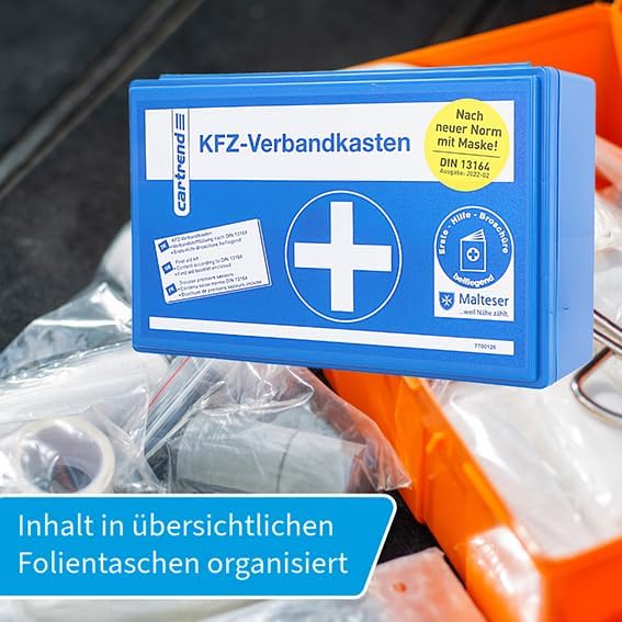 Оборудването на автомобила ви с аптечка за първа помощ за спешни случаи е не само препоръчително, но и задължително съгласно § 35h от Германския правилник за движение по пътищата (StVZO). Уверете се, че винаги разполагате с необходимото аварийно оборудване в колата си. Запознайте се с това, което трябва да носите за оказване на първа помощ. Списъкът с предмети, включени в аптечката за първа помощ cartrend, е в съответствие с DIN 13164. Приложената брошура за незабавни мерки за първа помощ ви помага да си припомните научените процедури при стресираща спешна ситуация. Това би трябвало да ви гарантира добра подготовка за неочаквани инциденти на пътя.