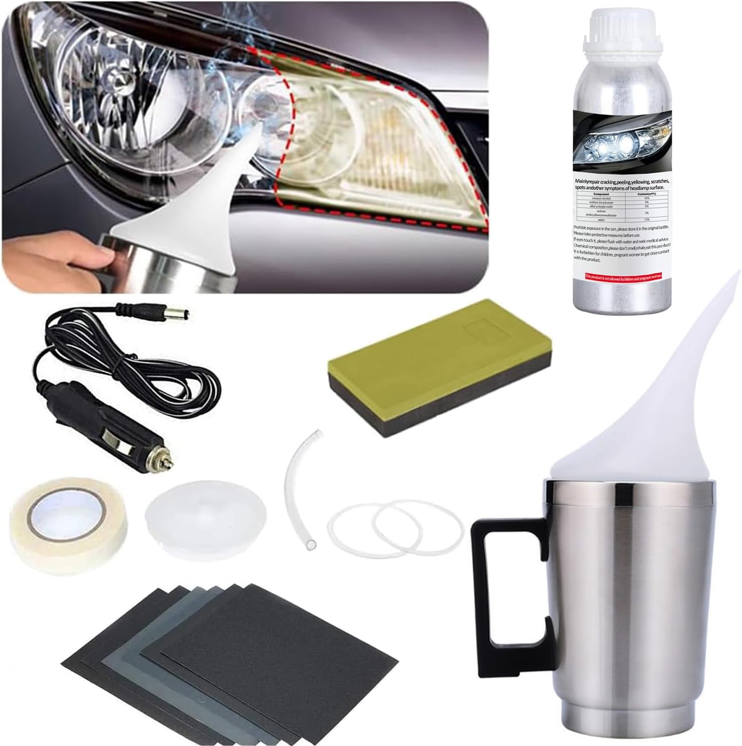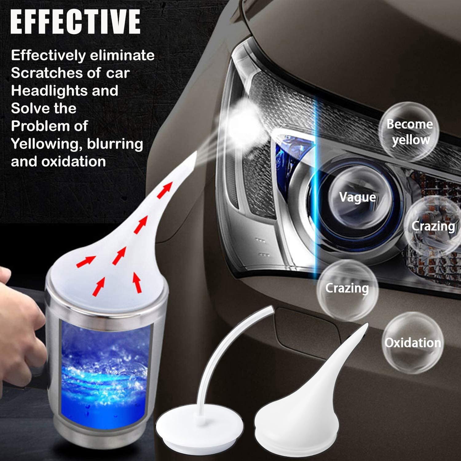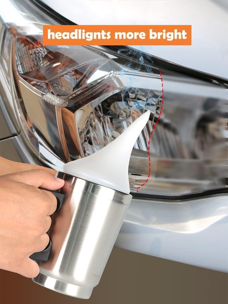 1. Stick protective tape around the car headlights, 2. Polish the headlight with different sandpapers so that its surface is no longer smooth, clean it with water and dry it with a towel. 3. Pour the repair solution into a atomiser cup and heat it until steam is created so that the steam sprays on the headlight and then dry naturally
