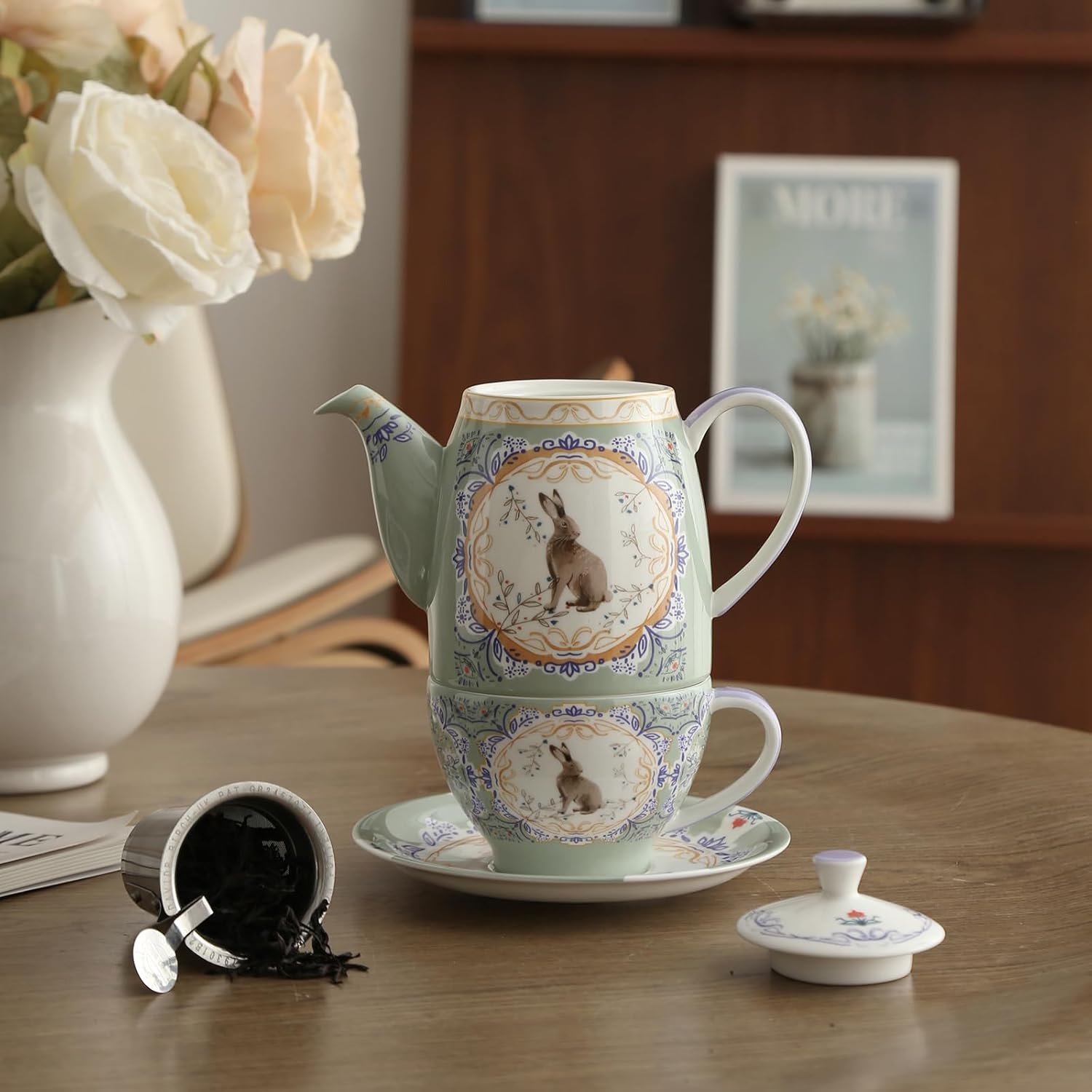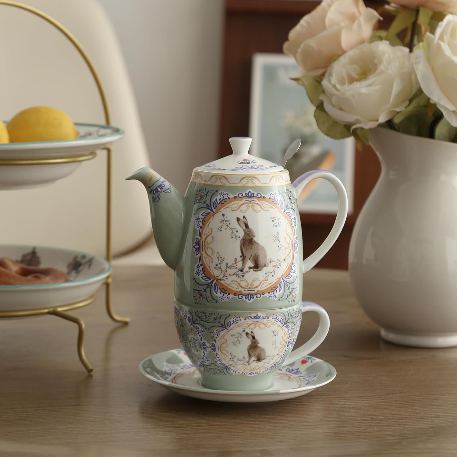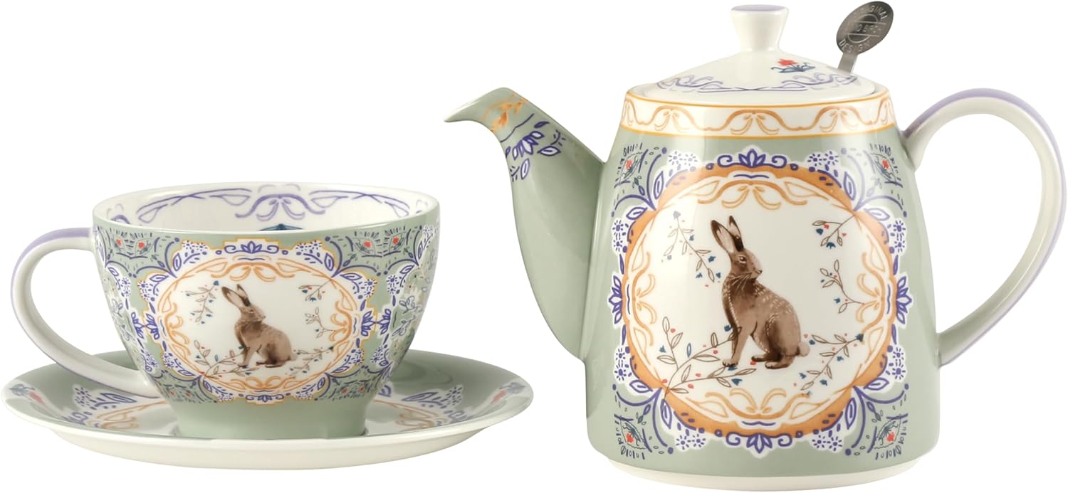 Комплект за сервиране и чайник от костен порцелан London Pottery за един човек, чайник, чаша и чинийка с животински мотив (заек)
