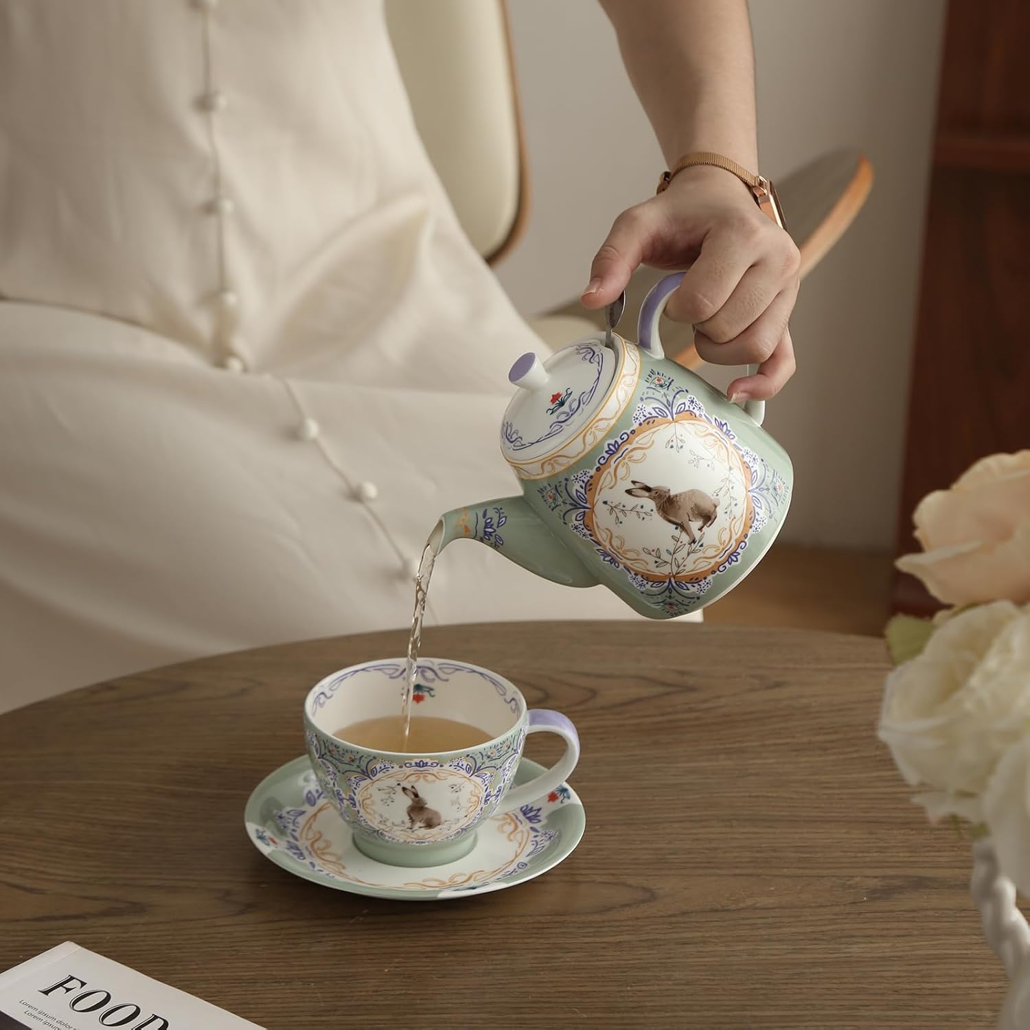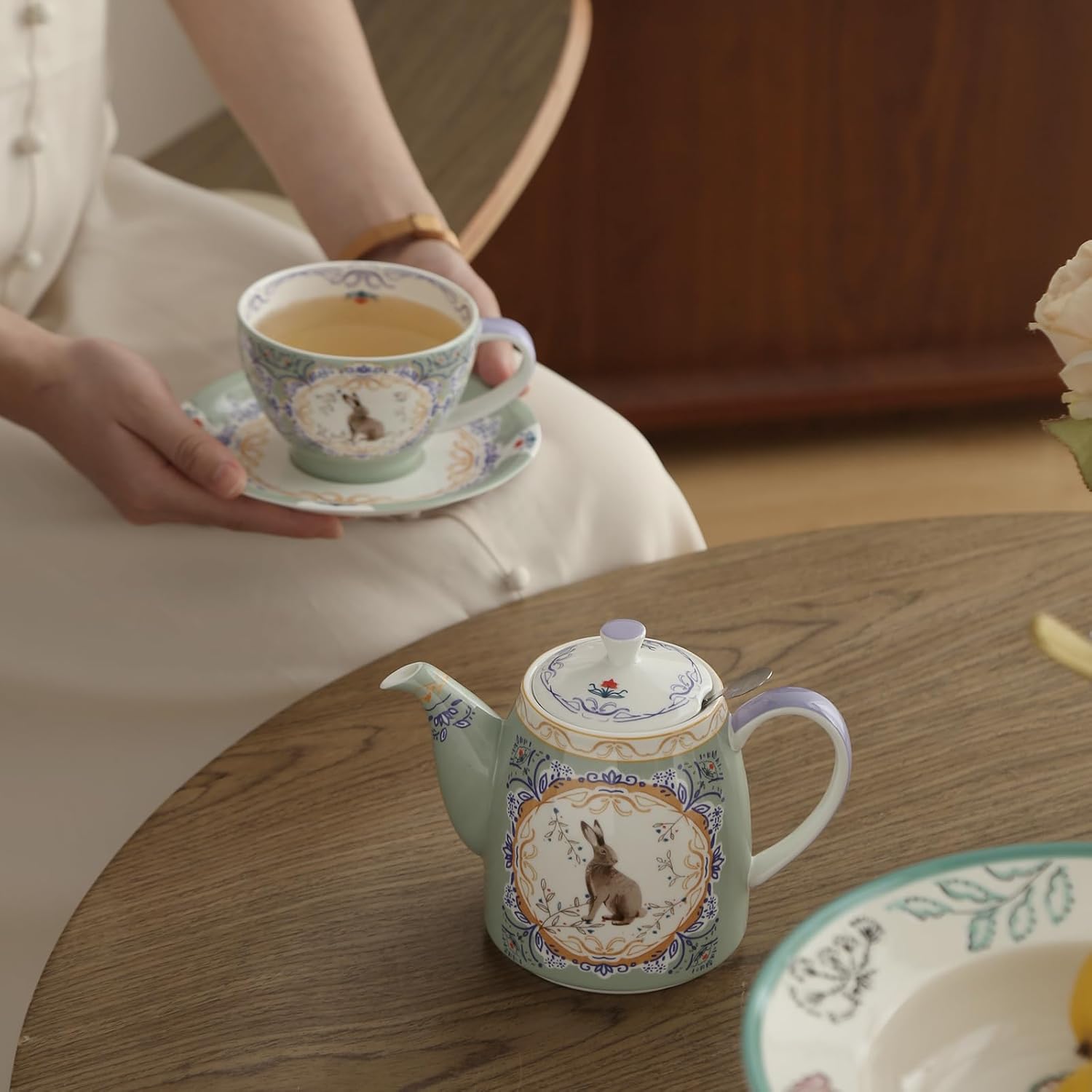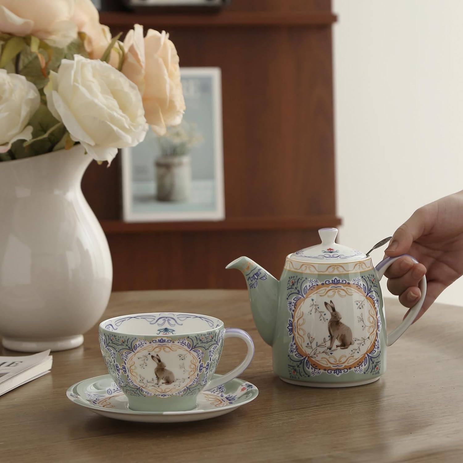 Комплект за сервиране и чайник от костен порцелан London Pottery за един човек, чайник, чаша и чинийка с животински мотив (заек)