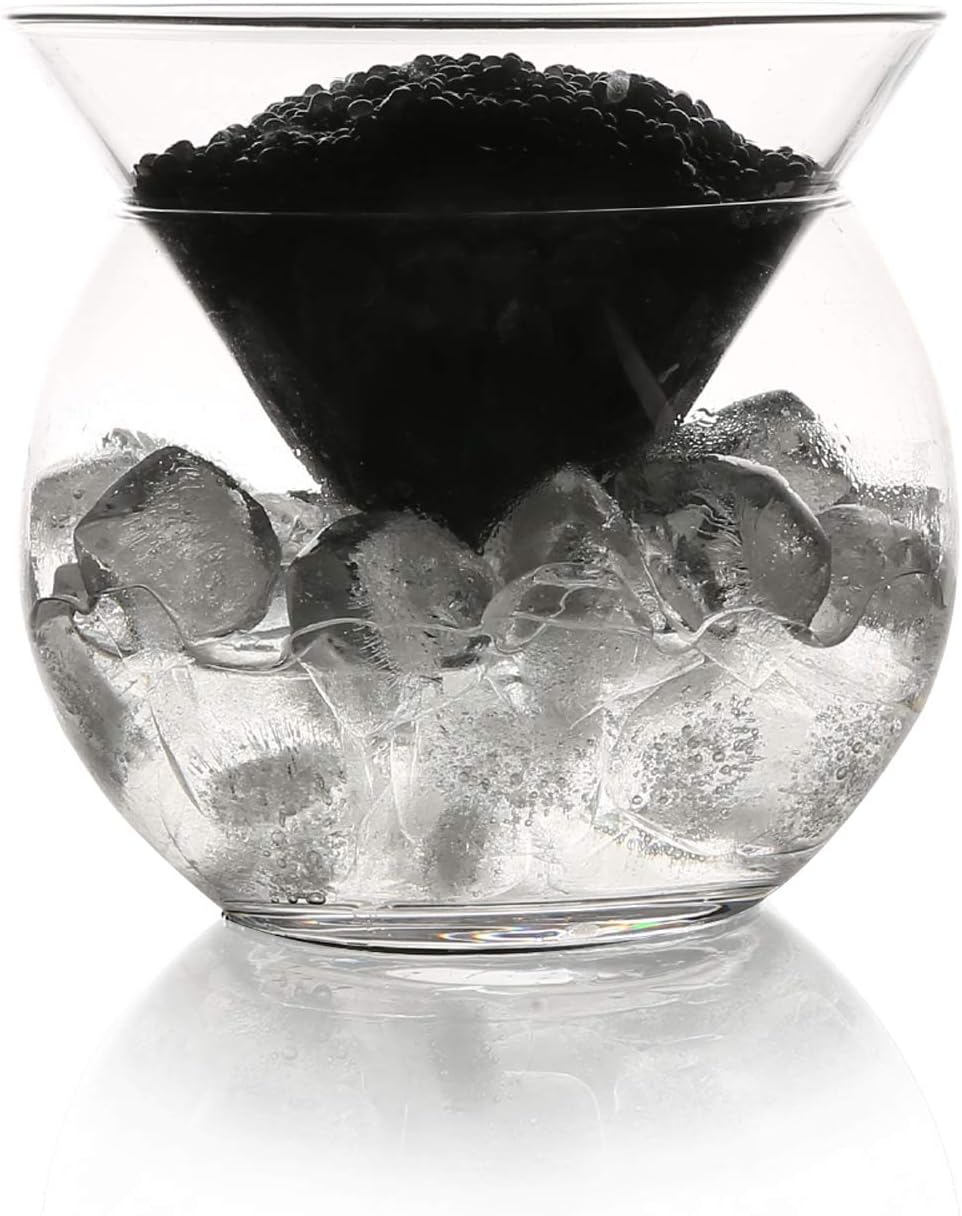 Този изискан стъклен сервиз за хайвер е идеалното допълнение към вашето мартини изживяване. Изработен от ръчно духано стъкло, този прибор съчетава форма и функция. Горната стъклена чиния за хайвер е поставена върху купа с натрошен лед, която от своя страна се поставя върху долна чиния, за да поддържа оптималната температура за вашия хайвер и да запази вкуса му. Ако хайверът се затопли твърде много, той може да загуби вкуса си, докато прекомерно ниските температури могат да доведат до замръзване и да нарушат деликатната текстура на яйцата. Идеален за партита или ресторанти - просто допълнете леда. Този ръчно духан стъклен сервиз за хайвер е идеален както за индивидуални порции, така и за големи банкети. Красив подарък за ценителите на хайвер!
