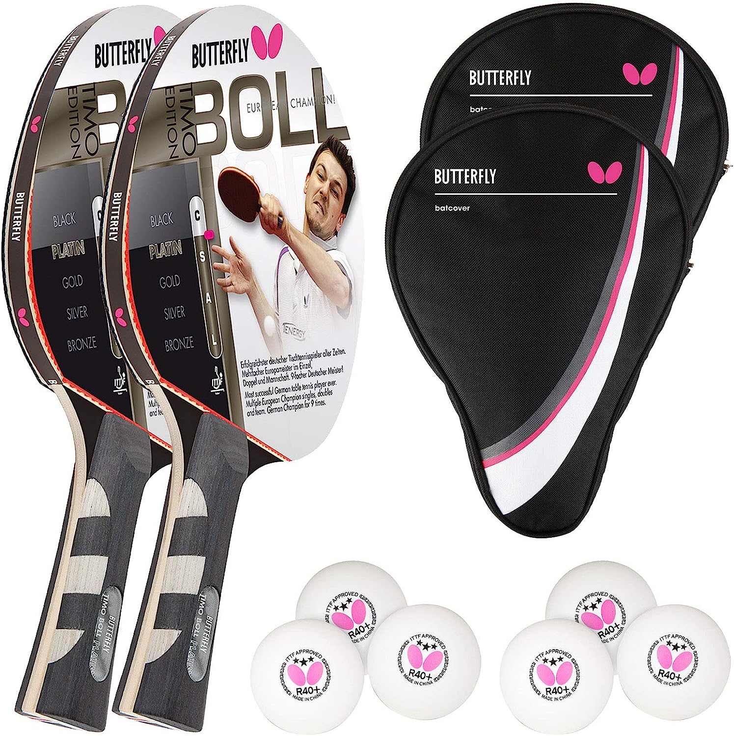 Комплект за тенис на маса Butterfly Timo Boll Platinum, Включва 2 хилки с гума 1.5мм, 6 топчета и 2 калъфа за съхранение