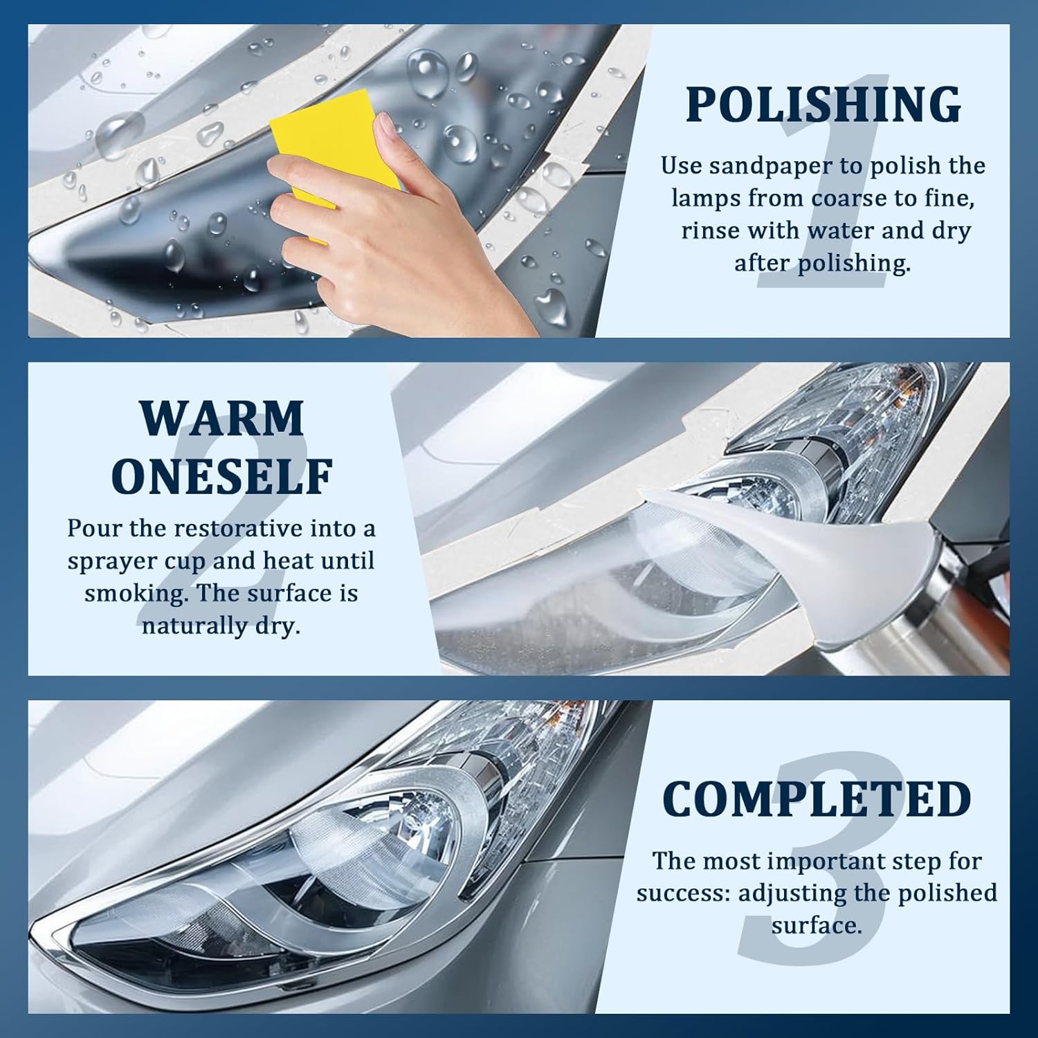 The kit restores the original clarity of the headlights, improving visibility and safety when driving, especially at night or in adverse weather conditions.