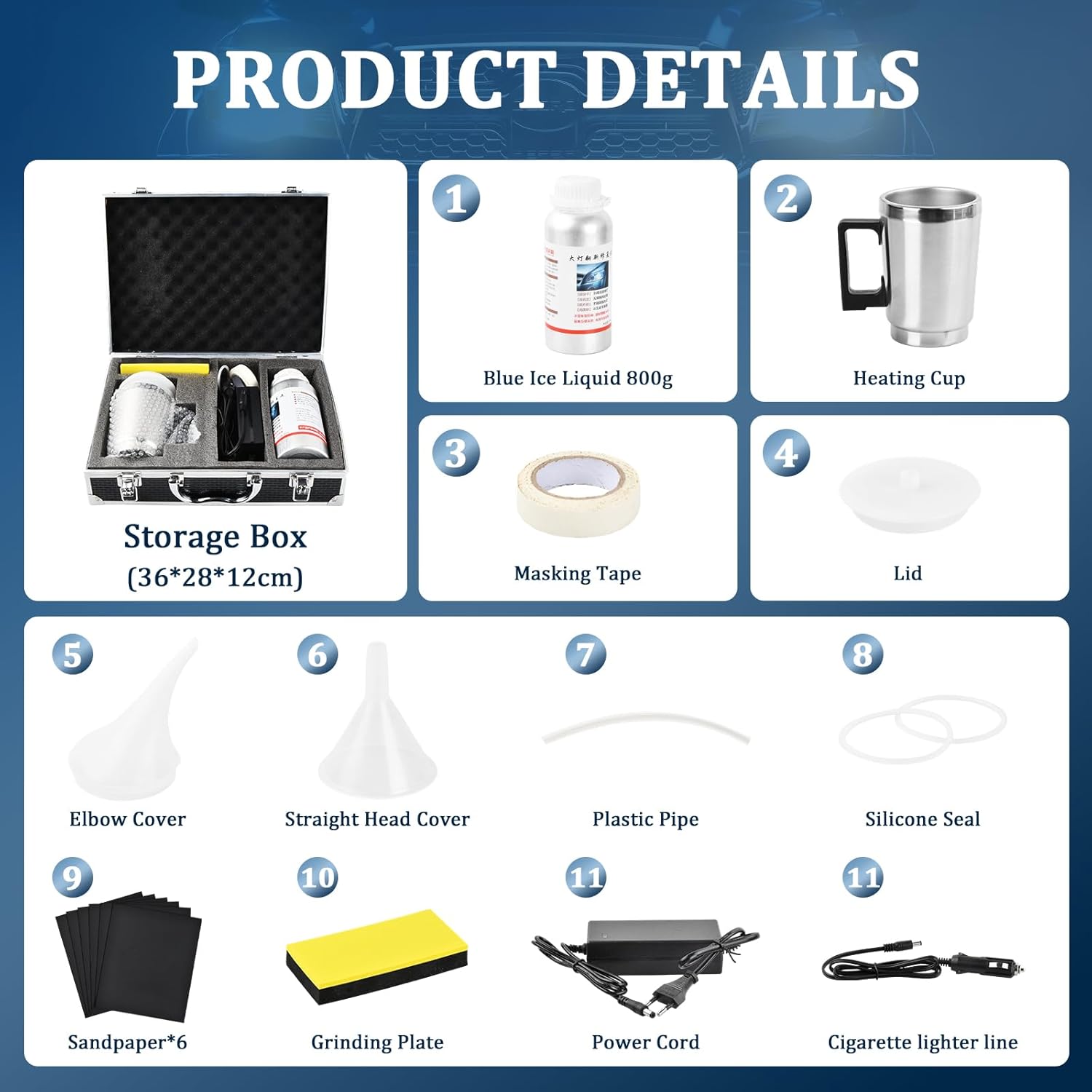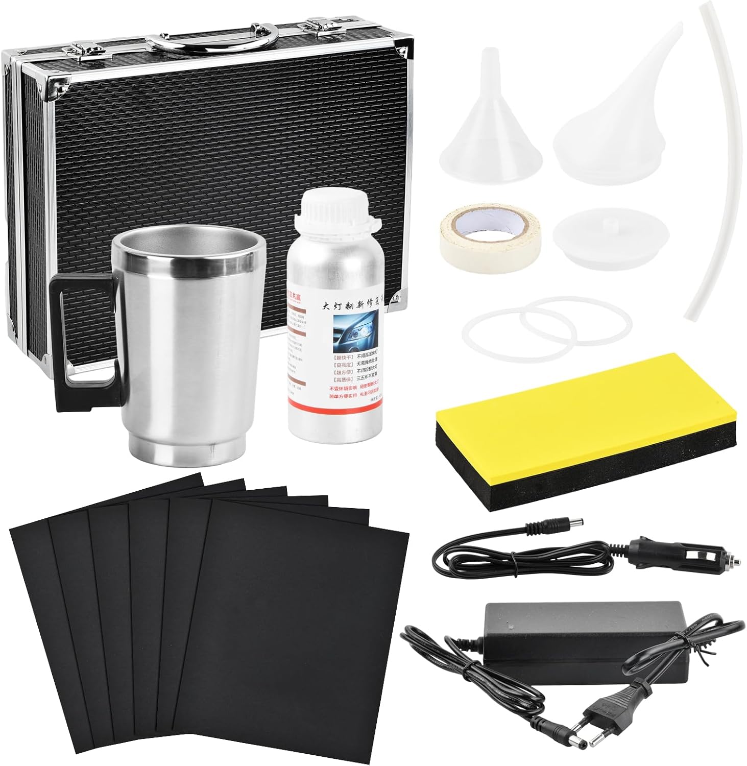 Комплектът за ремонт на фарове на автомобил съдържа: кутия с инструменти, нагревателна чаша, ремонтна течност, 2 захранващи кабела, 2 капака за чашките, фуния, шлифовъчна плоча, лента, 2 уплътнения, 6 листа шкурка, ръководство за употреба (английски език не е гарантиран).