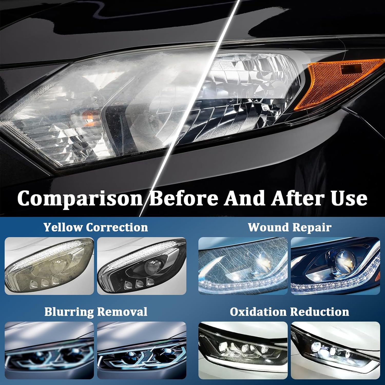 Комплектът е предназначен за ефективно отстраняване на често срещани проблеми с фаровете, като драскотини, пожълтяване, помътняване и окисляване, и за възстановяване на оригиналното състояние на фаровете.