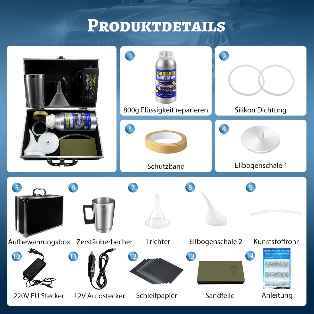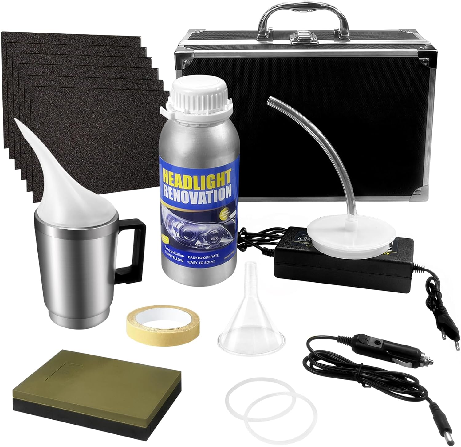 • Комплект за ремонт на фарове: Инструментът за ремонт на фарове Qunbanty е напълно оборудван, за да отговори на всичко необходимо, без да купувате допълнителни аксесоари, спестявайки време и енергия. Доставя се с голям капацитет от 800 г за ремонт на фарове, кутия за инструменти, чаша за пръскане, два капака, два адаптера (кабел за кола / зарядно устройство 220V), 6 вида шкурка (180/280/320/600/800/1200), фуния, защитна лента, шкурка, инструкции. Ефективно решава проблеми като драскотини, пожълтяване, замъгляване и окисляване на автомобилните фарове.