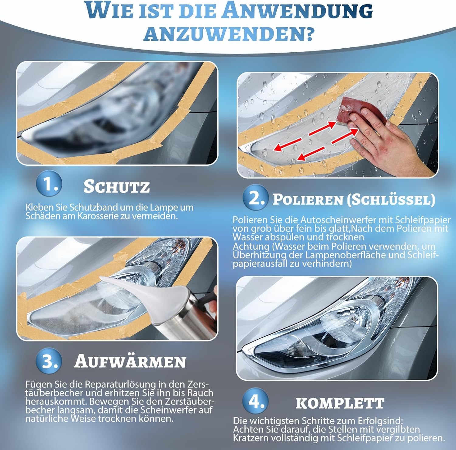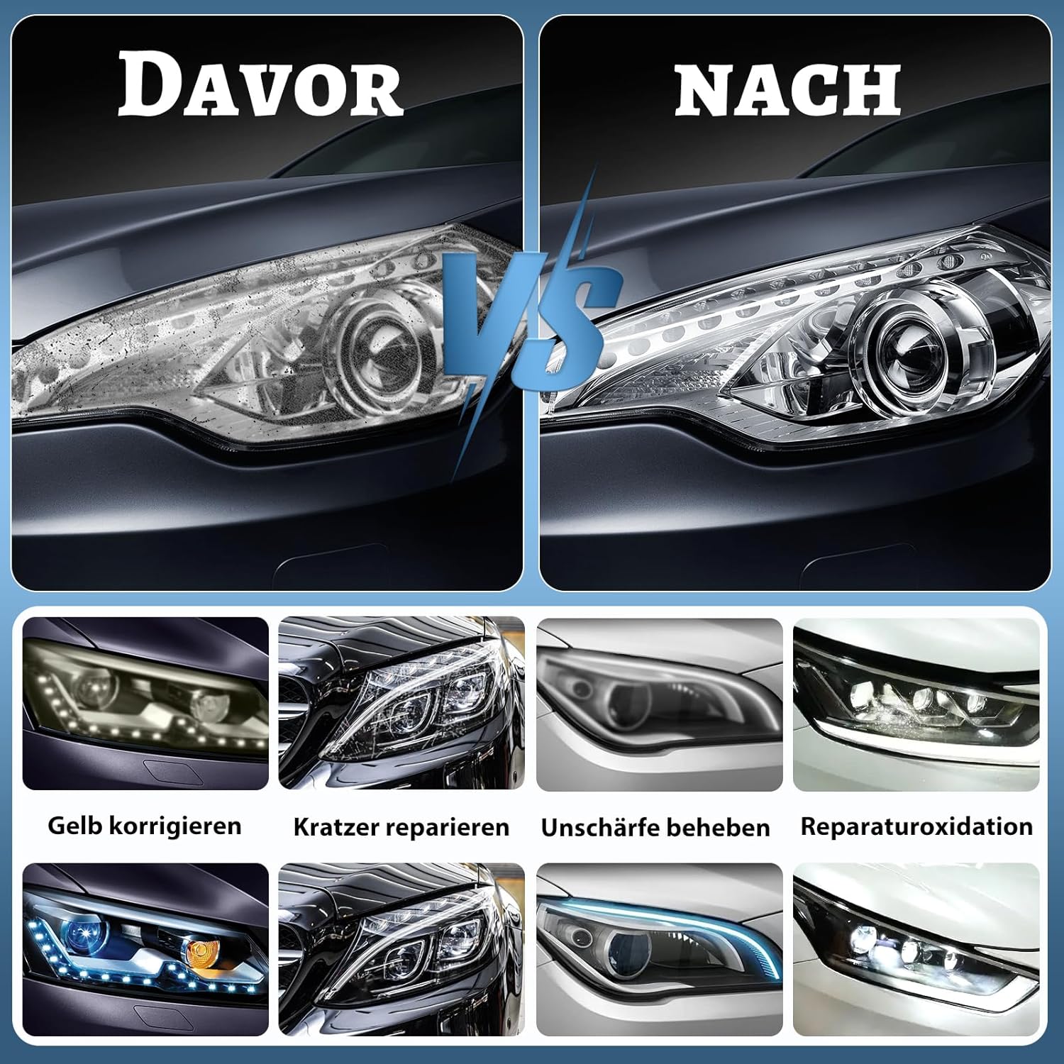 • Добър ефект на ремонт: с комплекта за ремонт на фарове можете ефективно да премахнете драскотини по фаровете на автомобила, като пожълтяване, замъгляване, окисляване, стареене и други проблеми. Удължете живота на светлините на автомобила. Увеличете осветлението на светлините и защитете безопасността на шофиране през нощта.