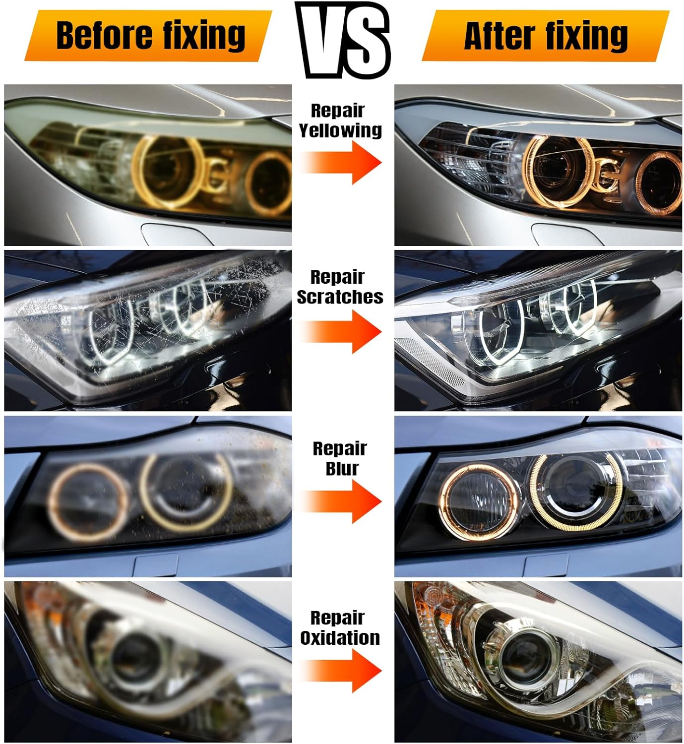 • Отличен ремонтен ефект: този комплект може да ремонтира замъглени, пожълтели и надраскани фарове, правейки ги по-ясни и по-ярки, спестявайки ви разходи за поддръжка