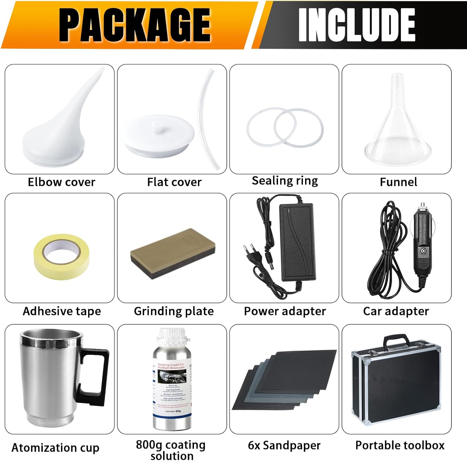 • Комплект за ремонт на фарове: този комплект се предлага с 6 различни вида шкурка, 2 захранващи кабела, 1 чаша за пулверизатор, 1 ролка защитна лента и 1 полираща плоча