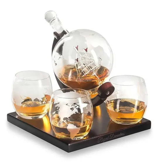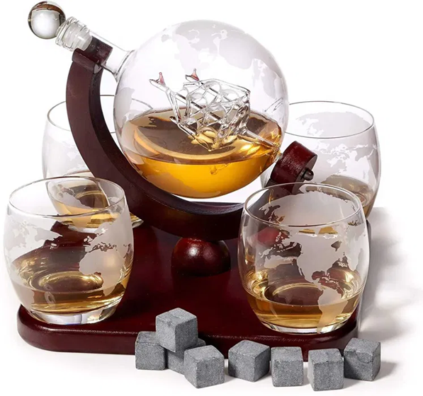 Комплект за уиски с 4 чаши глобус е начин да внесете повече вдъхновение в домашния си бар и пособия за сервиране на питиета, като издига ритуала на съвсем друго ниво. Погледнете снимките само – изящен стъклен глобус със силует на кораб във вътрешността. Готов да съхрани всяка ваша любима напитка. Поставен на подходящ поднос, на който място намират и четири класни великолепни чаши в същата стилистика. Истинско вдъхновение за разговори, специална обстановка, вдъхновена комуникация на всякакви теми с приятели, близки, колеги. Всеки заслужава да има повече красота в живота си. Затова, не правете компромиси и с домашния бар и пособията в него и си осигурете най-доброто.