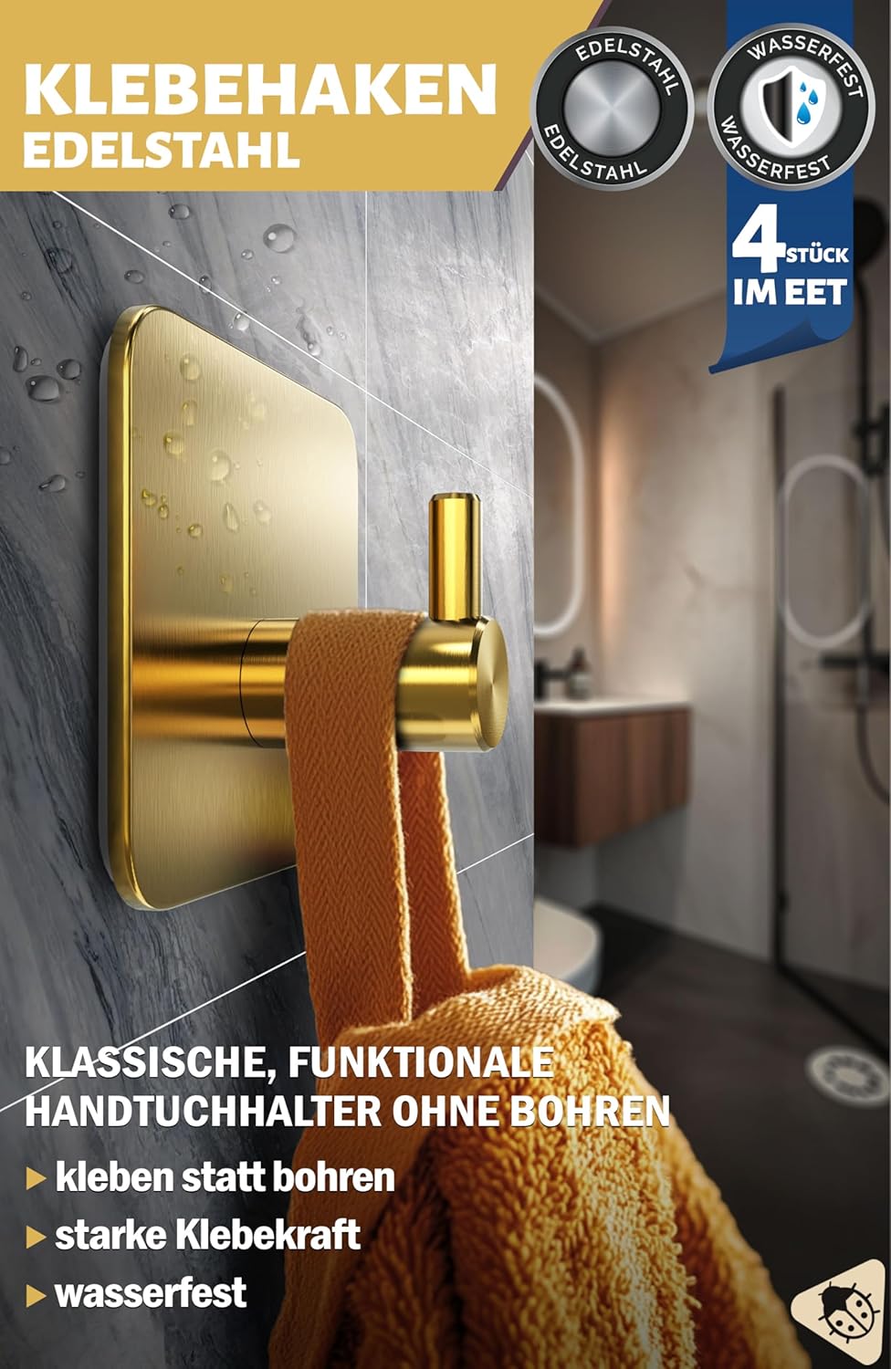 Комплект закачалки за кърпи Menz без пробиване, 4 куки, златисти - водоустойчиви самозалепващи се куки, кукички за кърпи от неръждаема стомана за баня, висококачествени самозалепващи се куки, държач за кърпи за баня с висока товароносимост