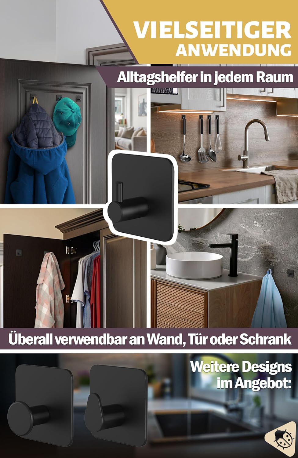 • Многофункционална употреба: универсални самозалепващи се стенни куки като стилен аксесоар за баня, елегантен държач за кърпи за кухня, практични самозалепващи се куки за палта за врата, стена, шкаф във всяка стая - функционални задължителни неща за първия апартамент