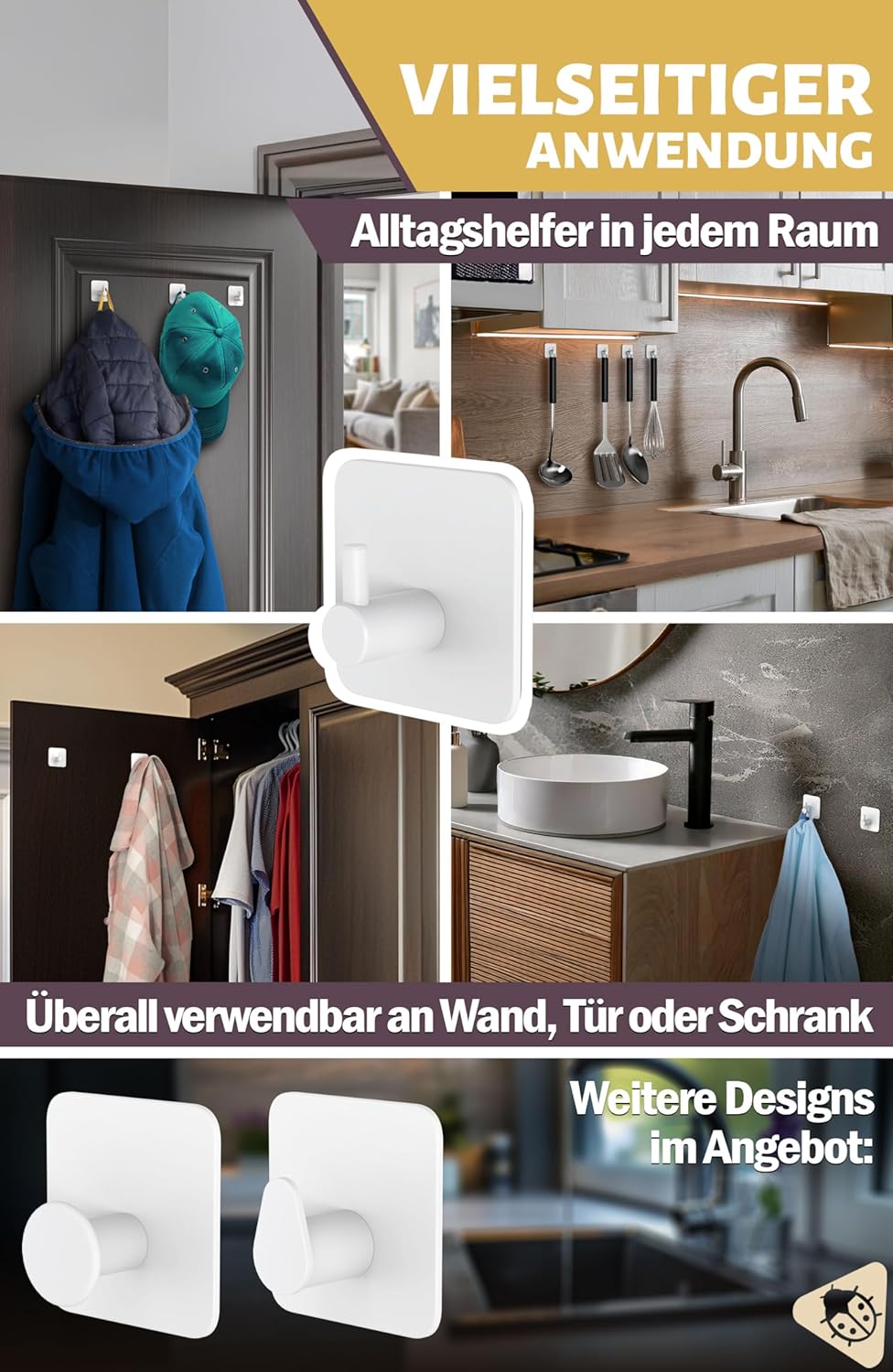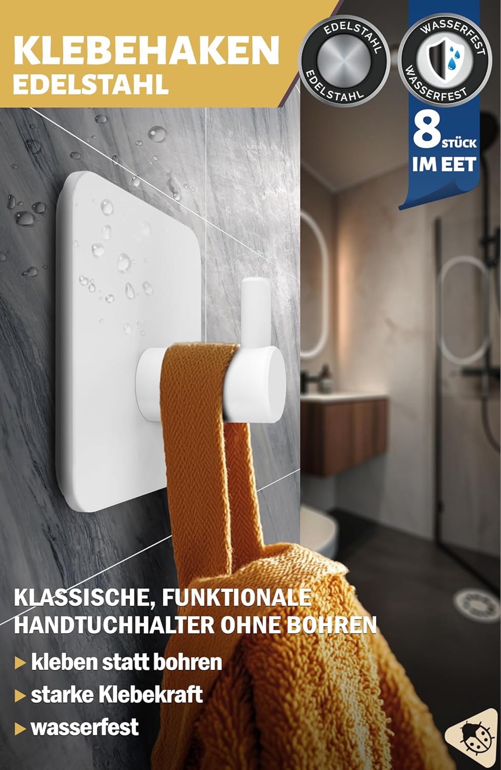 • Куки без пробиване: лесни за монтаж върху всички гладки повърхности благодарение на водоустойчивите лепящи подложки 3M; куките за кърпи без пробиване издържат до 10 кг, дори когато са мокри. Идеални лепящи куки за баня за мокри помещения.
