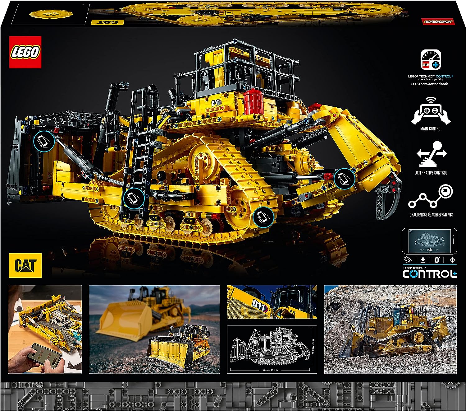 • Включва строително превозно средство, управлявано дистанционно чрез приложение: реплика на най-големия CAT булдозер.