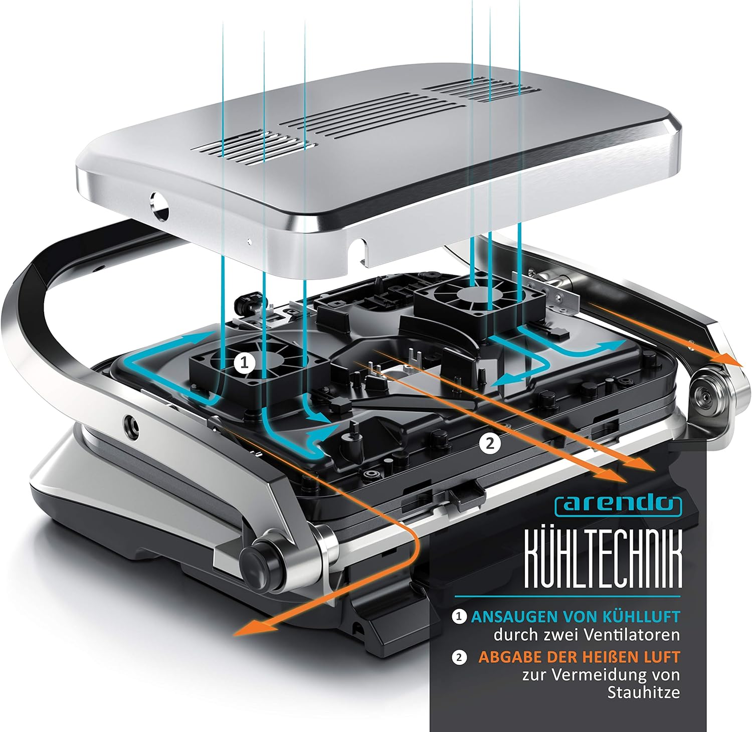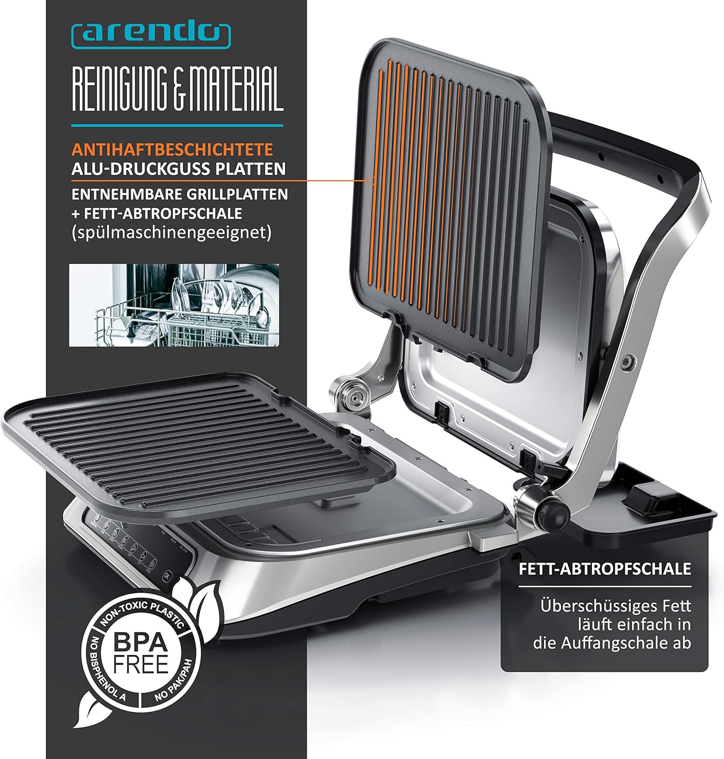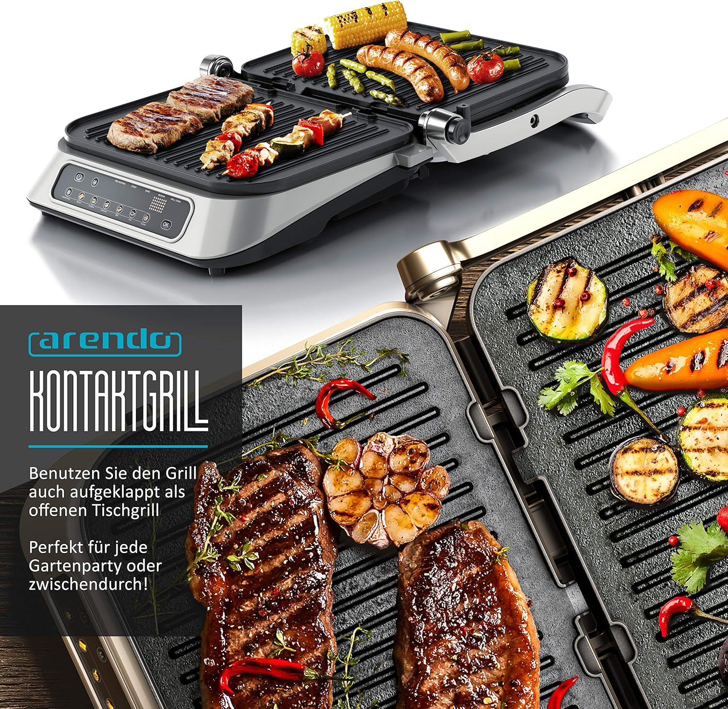 • Здраво конструираната контактна скара от Arendo е истински универсален уред. Препоръчва се за приготвяне на месо, риба и колбаси, бургери, буритос, препечени филийки и хлебчета. Можете да печете, готвите и гратинирате храна. С двете контактни повърхности можете да приготвите месото си особено вкусно на следващото градинско парти и да получите типичните шарки на скара. Когато е разгъната, устройството може да се използва като настолна скара, например за лентички бекон | 303791 хладно сиво