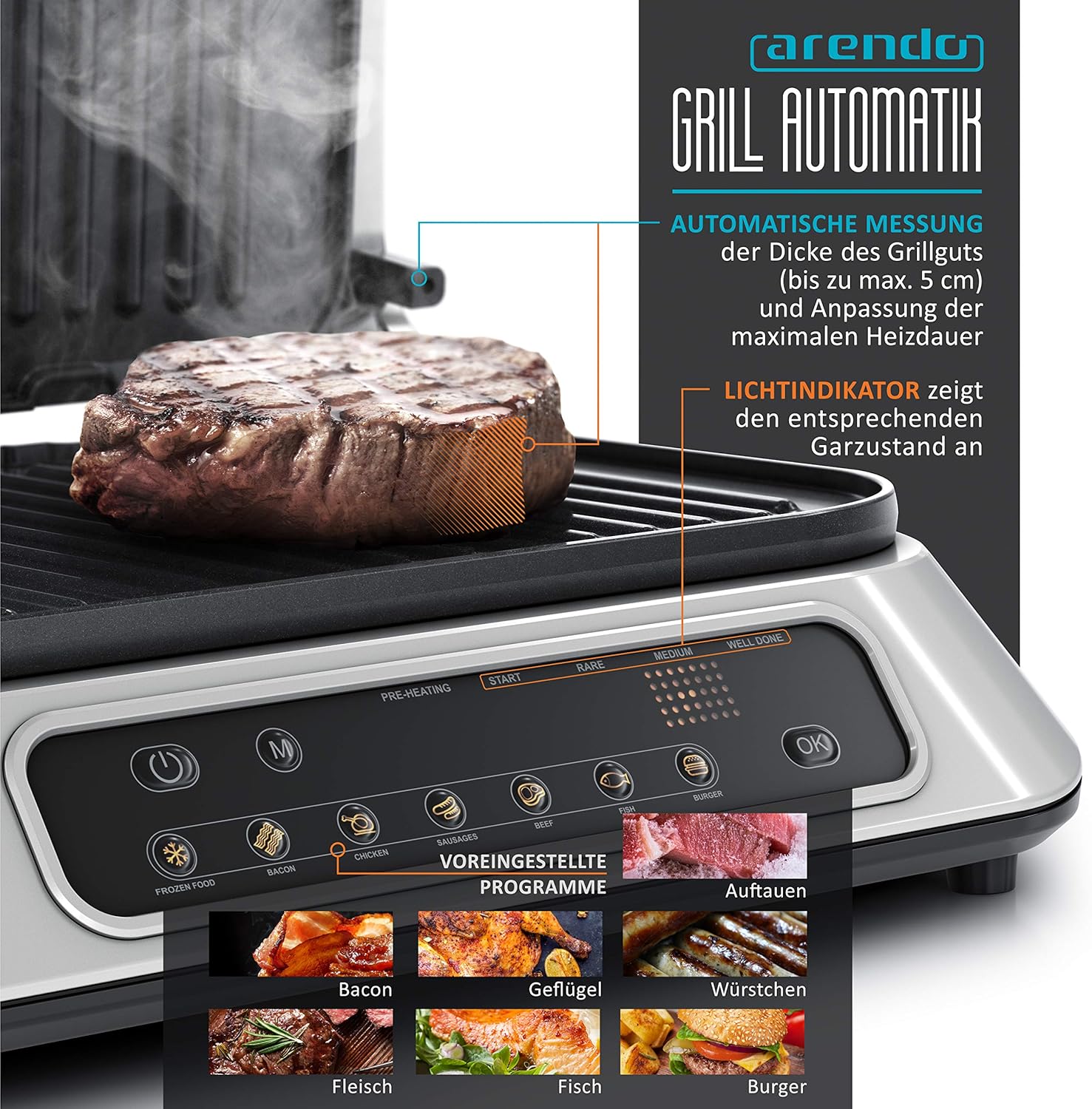 • Контактната скара измерва дебелината на храната (до 5 см) с магнитен сензор и автоматично настройва времето за печене. В ръчен режим може да се достигне максималната топлинна мощност (250 °C).
