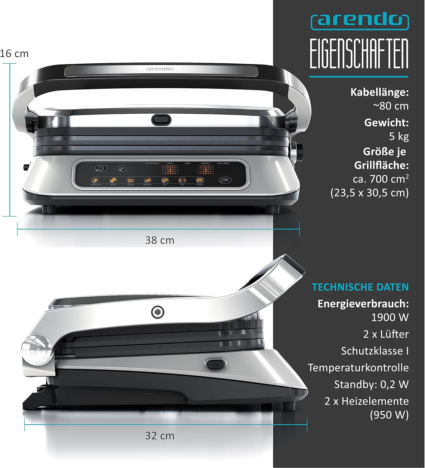 Контактна скара Arendo, електрическа скара с цифрово управление, 1900 W, електрическа настолна скара за сандвичи, 7 програми, неръждаема стомана с незалепващо покритие