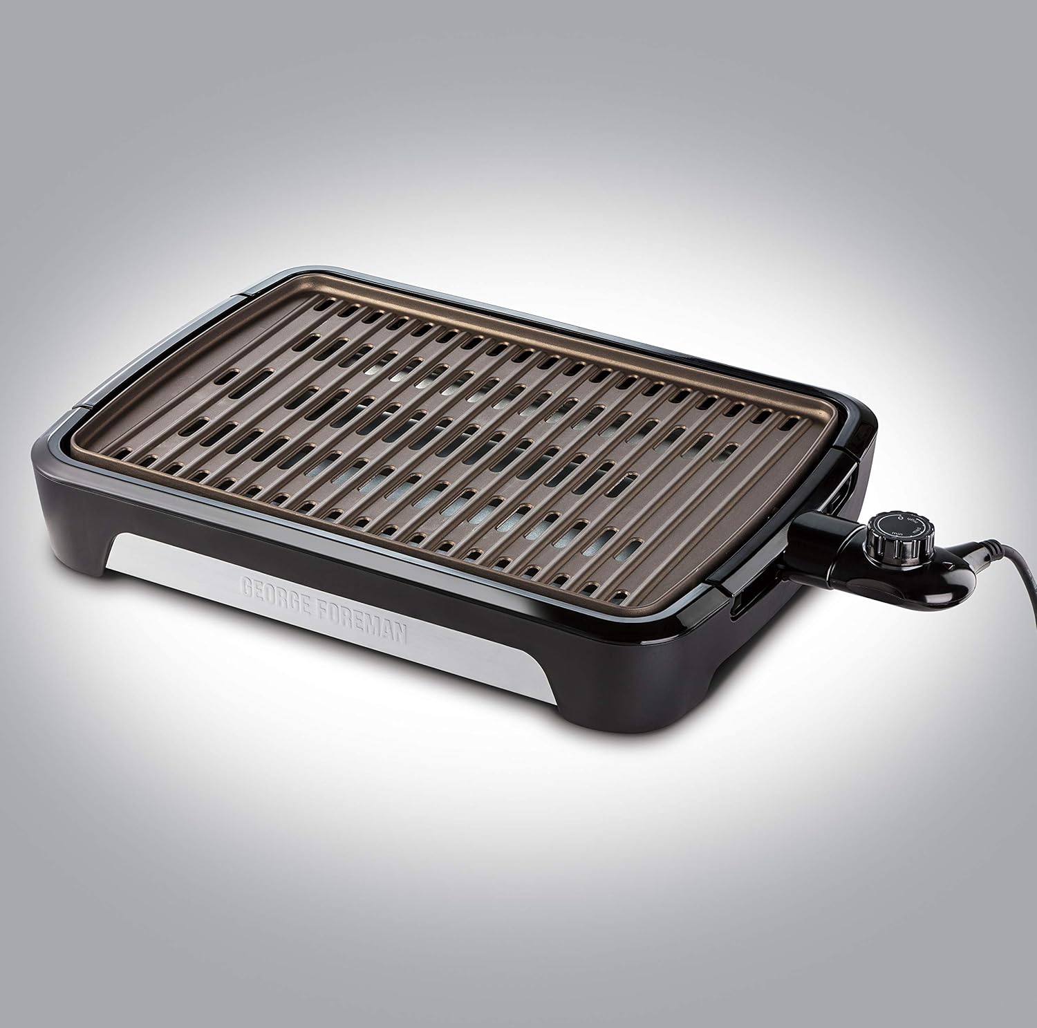 The George Foreman Smokeless Contact Grill has been specially designed to allow low-smoke contact grilling with up to 87% less smoke*. The lower grill plate of the George Foreman Smokeless contact grill is designed to direct hot grease and liquids directly into the drip tray where they cool quickly. Since they do not burn directly on the grill surface, the formation of smoke and smell is minimised. The integrated ventilation system allows cool air to enter the device so that it does not overheat and prevents the burning of fat on the grill plate/drip tray. This prevents oily odours.