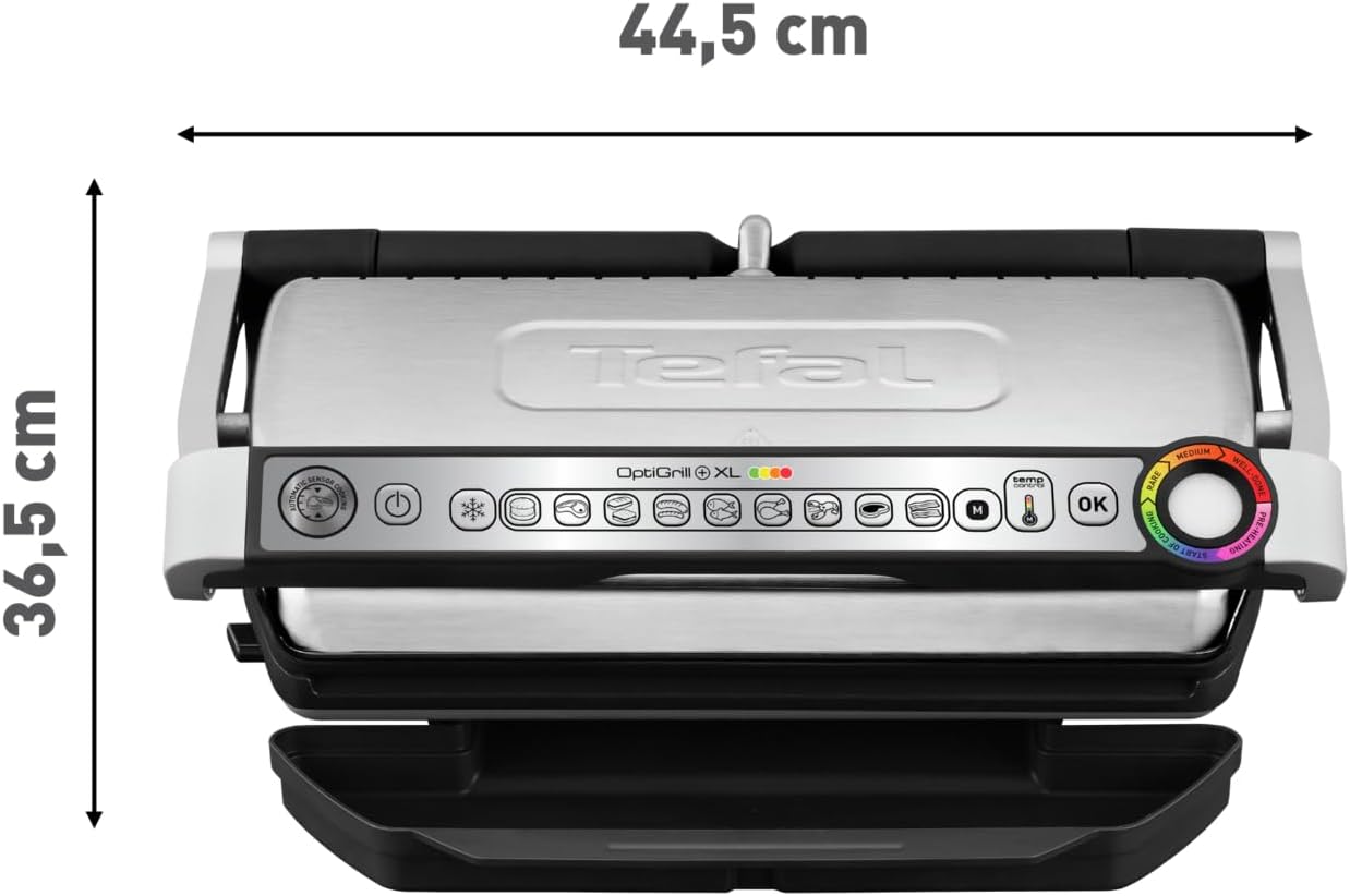 Контактна скара Tefal OptiGrill XL GC722D (с XL грил повърхност, плюс модел с допълнителни температурни настройки, 2000 вата, автоматично показване на състоянието на готвене, 9 предварително зададени програми) черно/сребристо