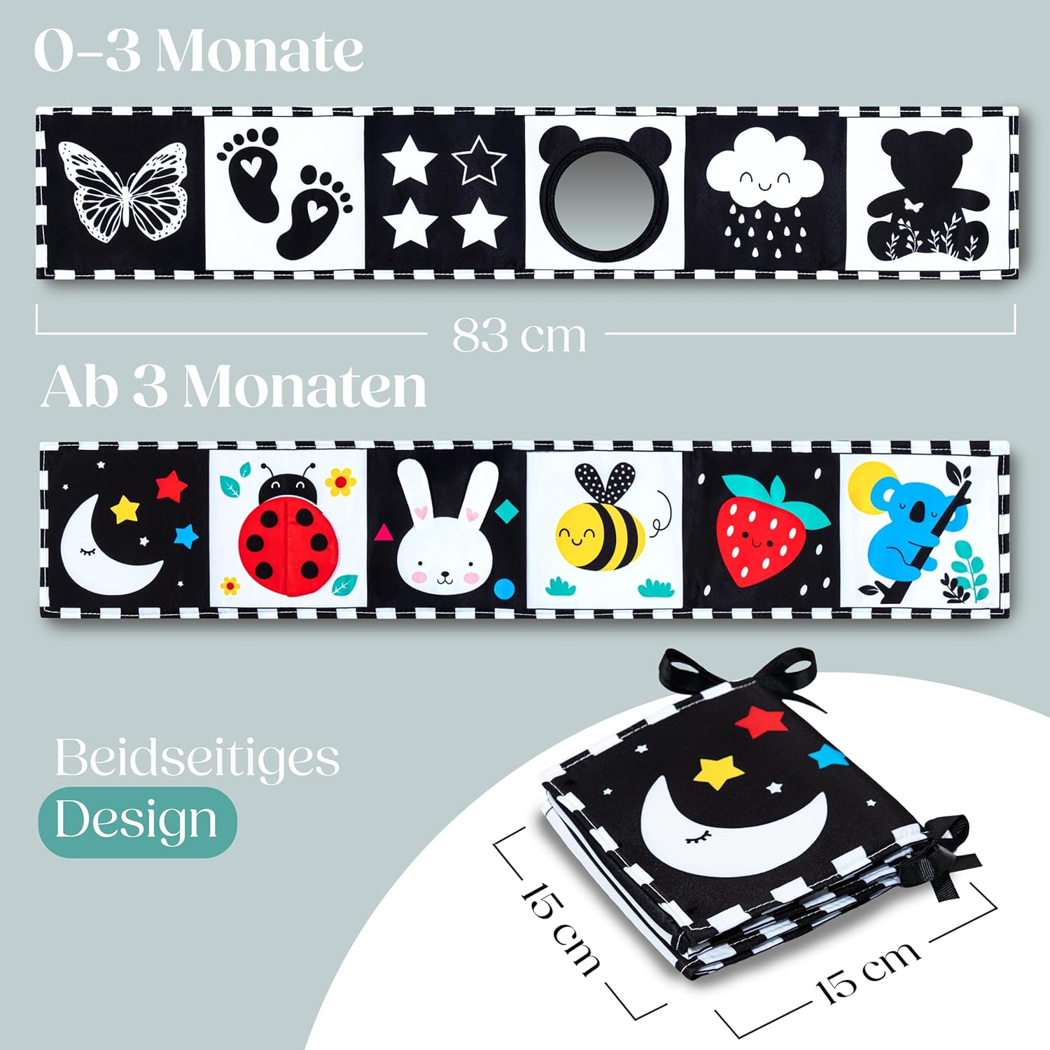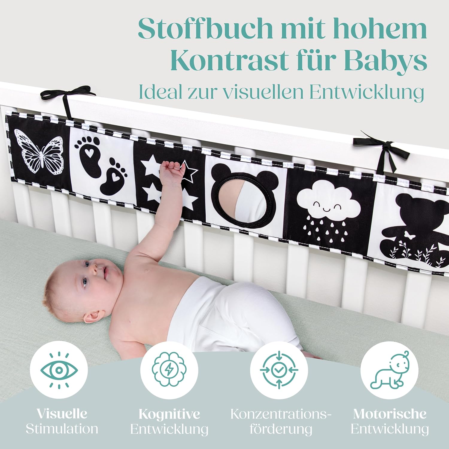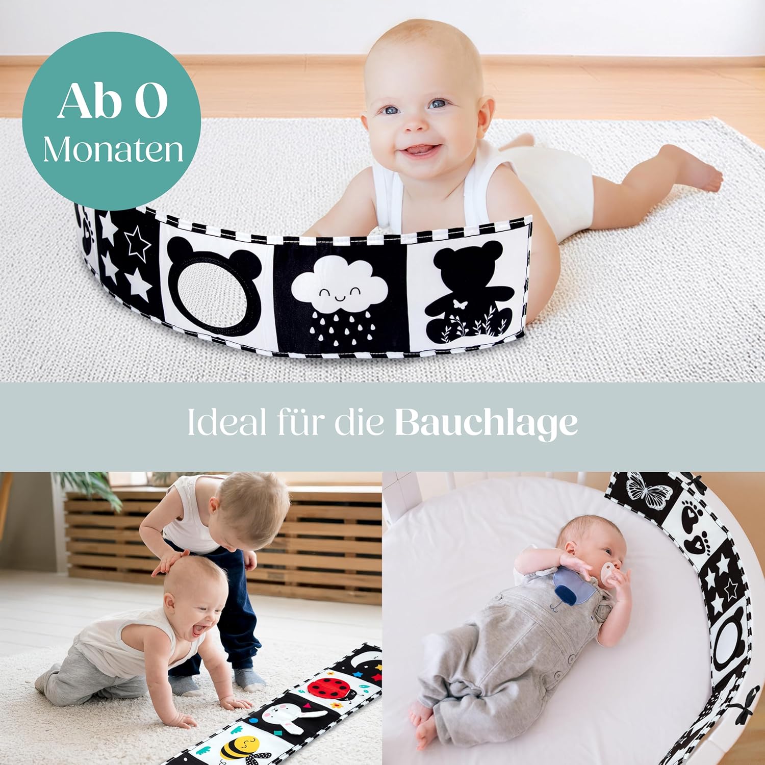 • ПЕРФЕКТНА ИГРАЧКА ЗА КОРЕМА – Простите изображения с висок контраст привличат вниманието на бебето, насърчават зрителното развитие и го насърчават да повдига глава – което подпомага развитието на мускулите по естествен и игрив начин.