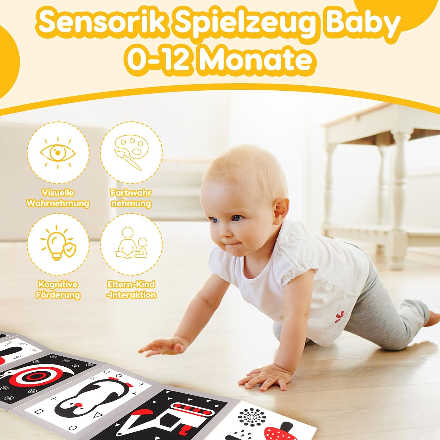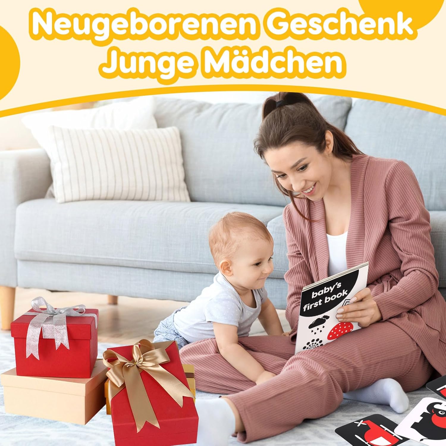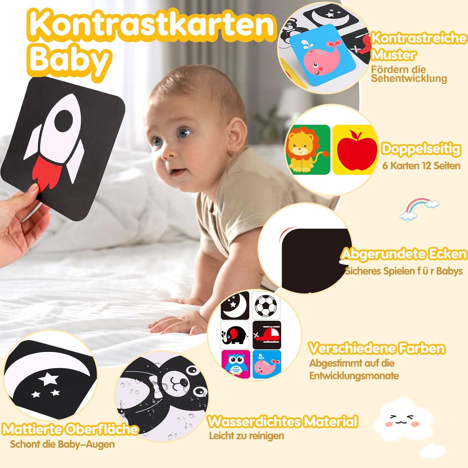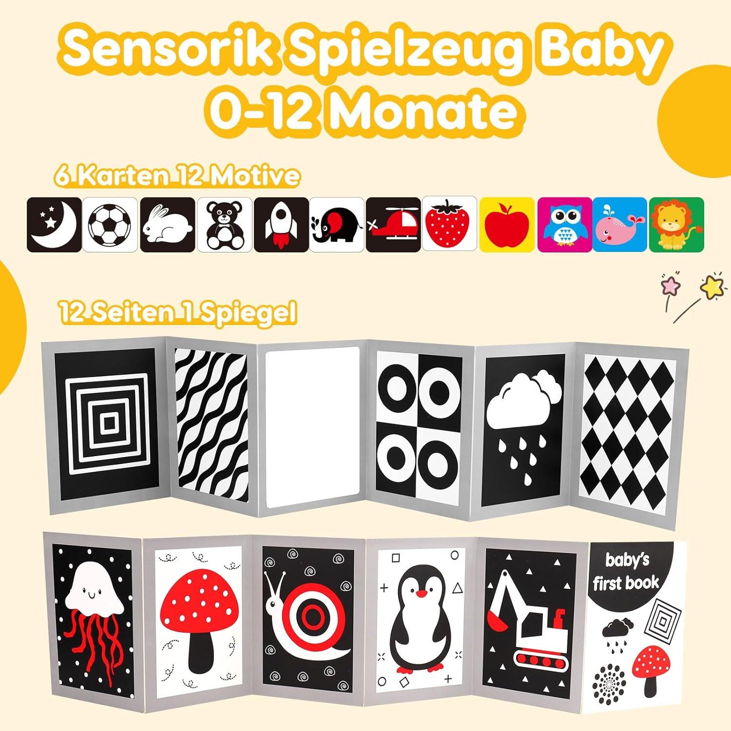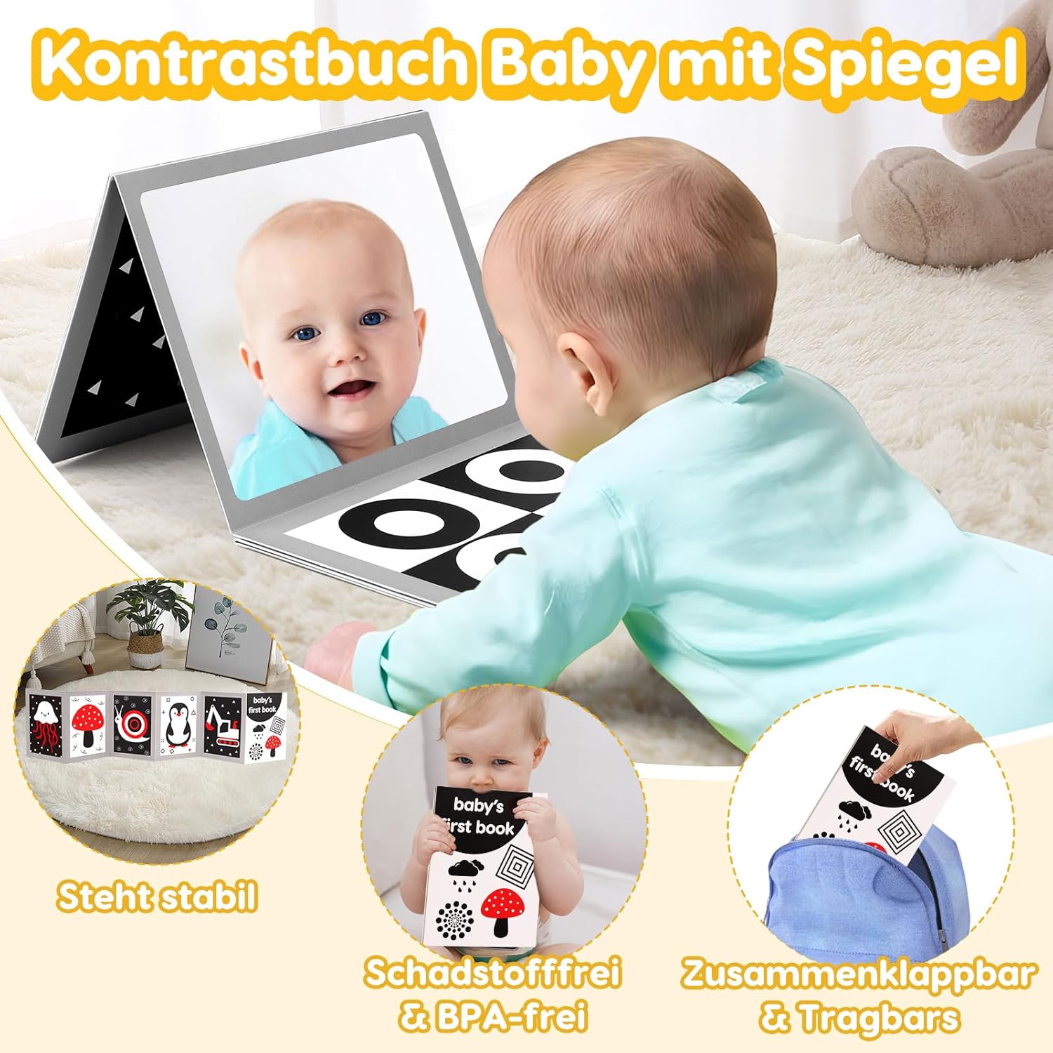 1. Platzieren Sie das Baby auf den Bauch, um die Tummytime zu beginnen. 2. Stellen Sie das schwarz-weiß Babybuch zu einem stabilen Dreieck auf, um das Baby während der Bauchlage optimal zu motivieren. 3. Nutzen Sie den Spiegel, um das Baby auf Gesichter zu konzentrieren und es während des Windelwechsels abzulenken. 4. Wechseln Sie die kontrastreichen Schwarz-Weiß-Muster und bunten Sensorik-Karten, um das Interesse des Babys aufrechtzuerhalten und seine Sinne zu stimulieren.