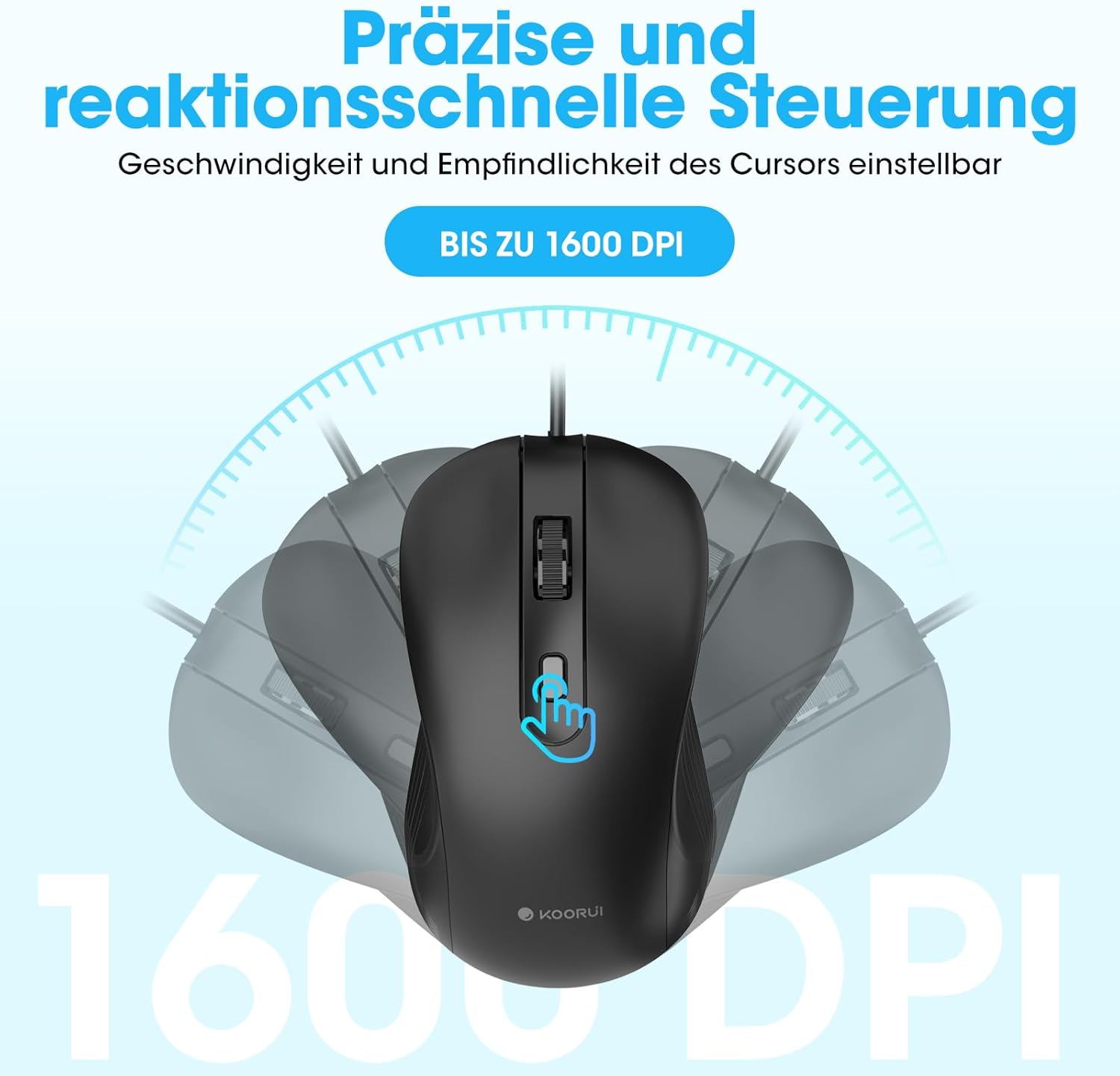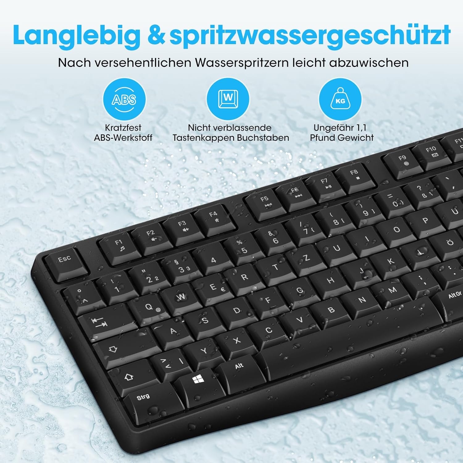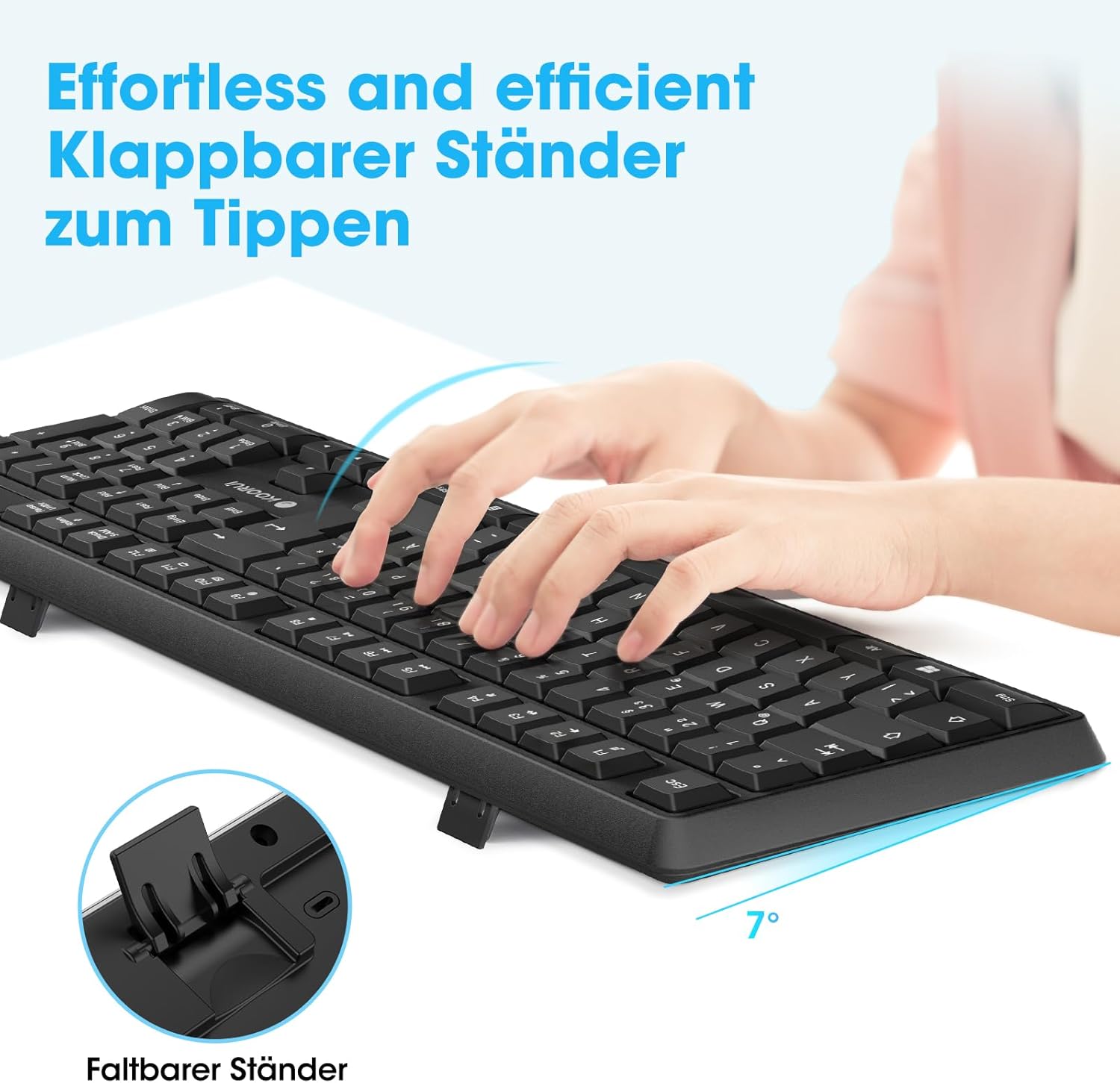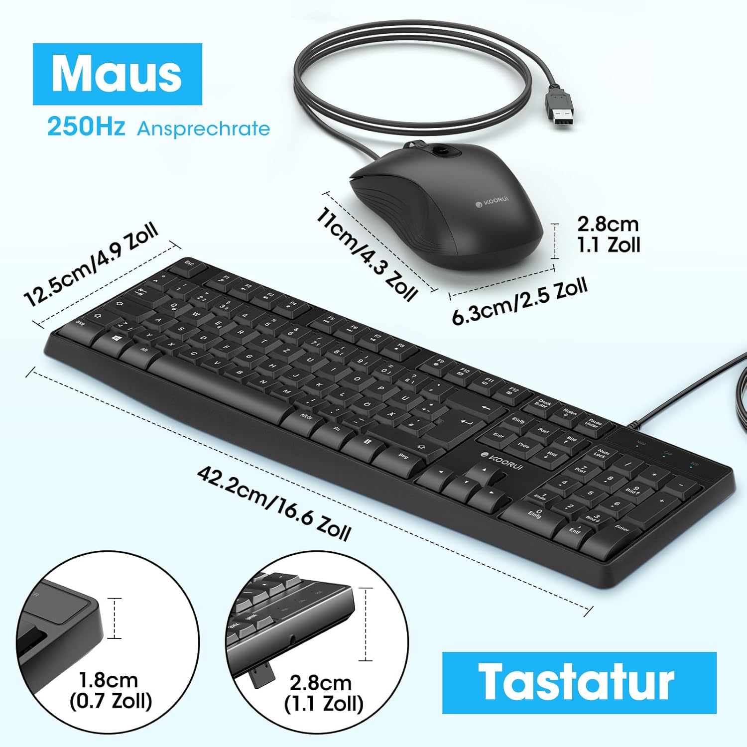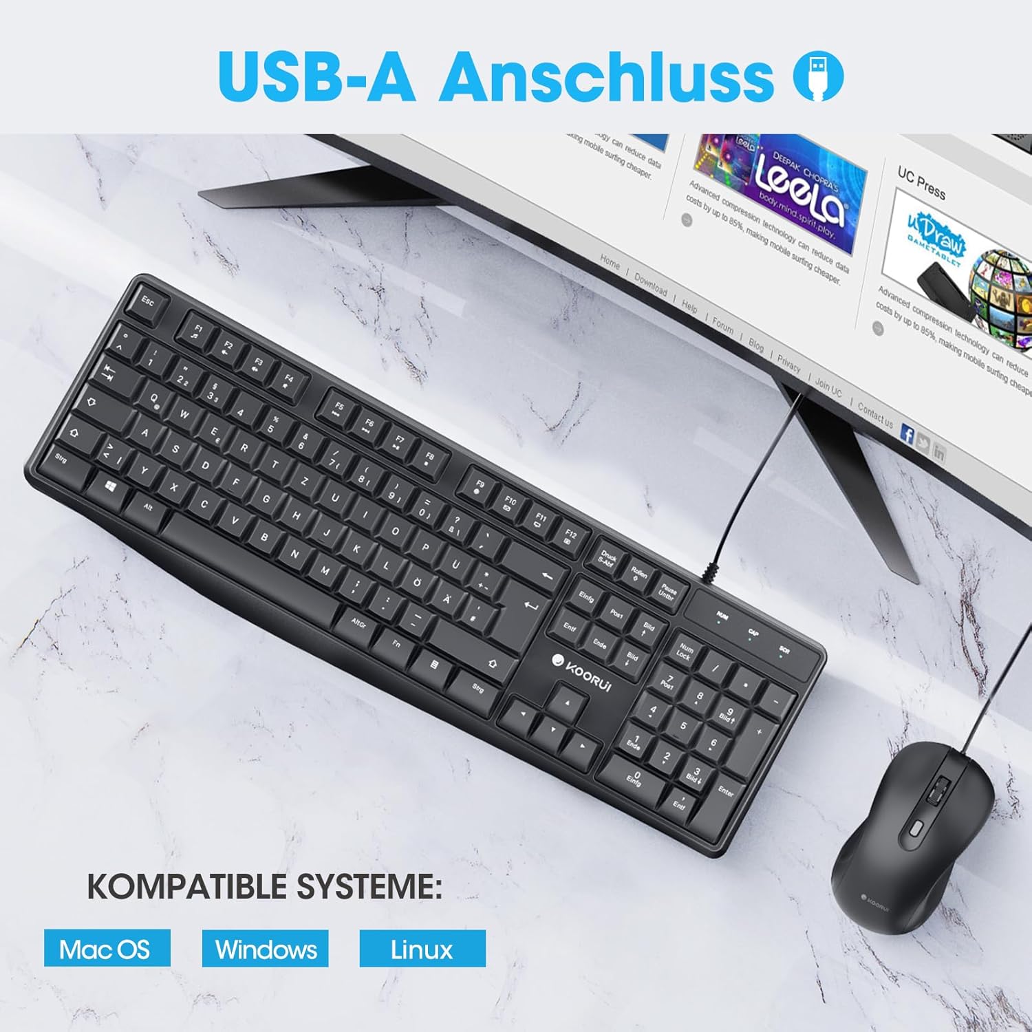 KOORUI Клавиатура и мишка, Комплект клавиатура и мишка с немска подредба QWERTZ с 12 функционални клавиша, комплект клавиатура и мишка за Windows, MacOS, Linux, черен