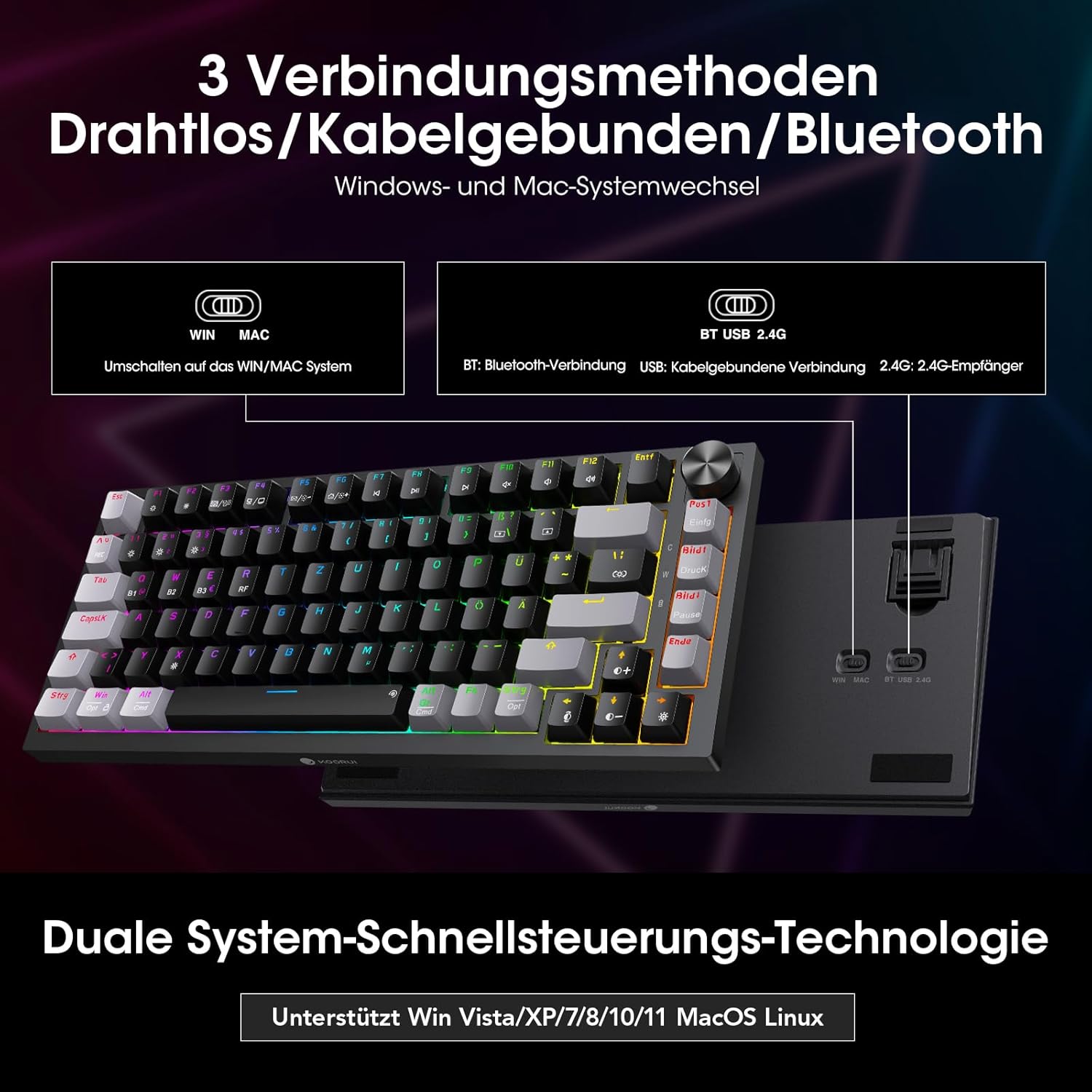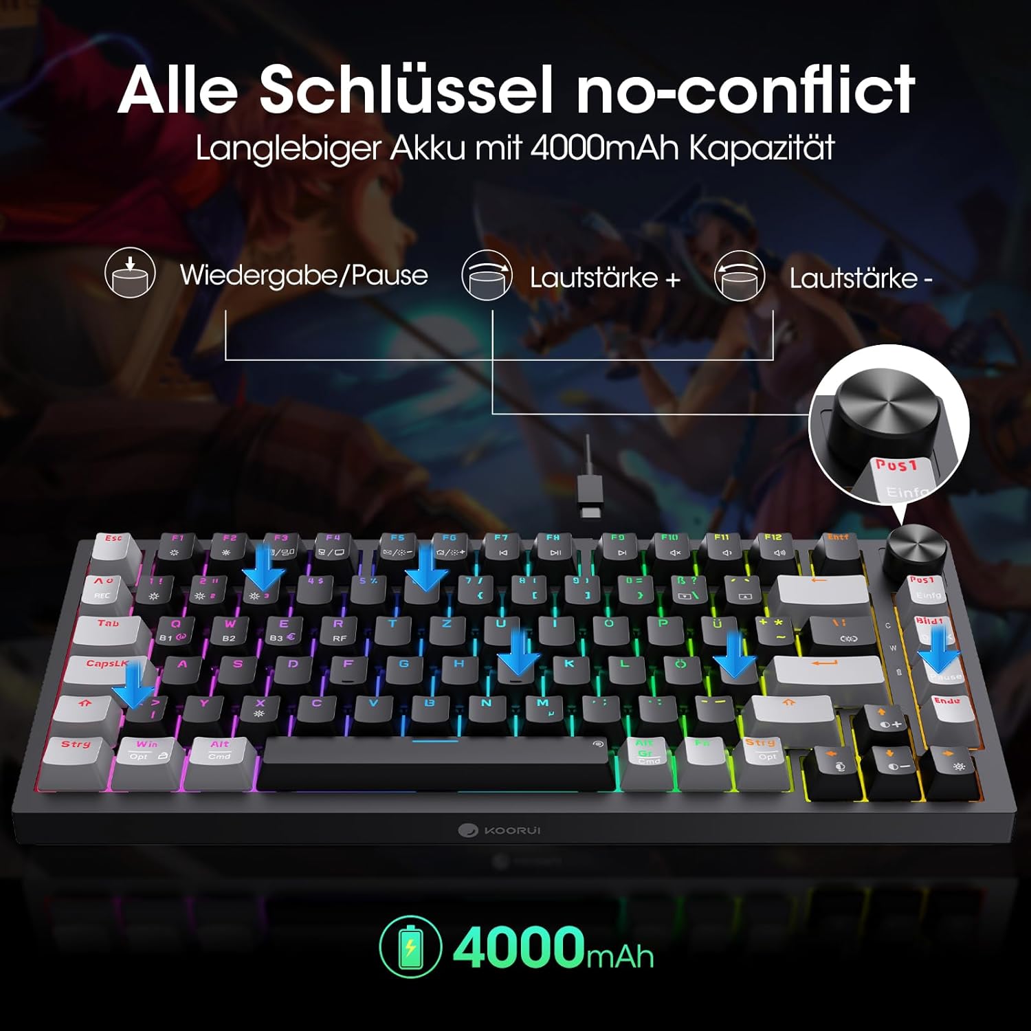 KOORUI Механична клавиатура, Геймърска клавиатура Безжична/Кабелна/Bluetooth 26 RGB Акумулаторна 4000 mAh Батерия 82 Клавиши Немско Разположение QWERTZ за Windows MacOS Linux Червен Switch