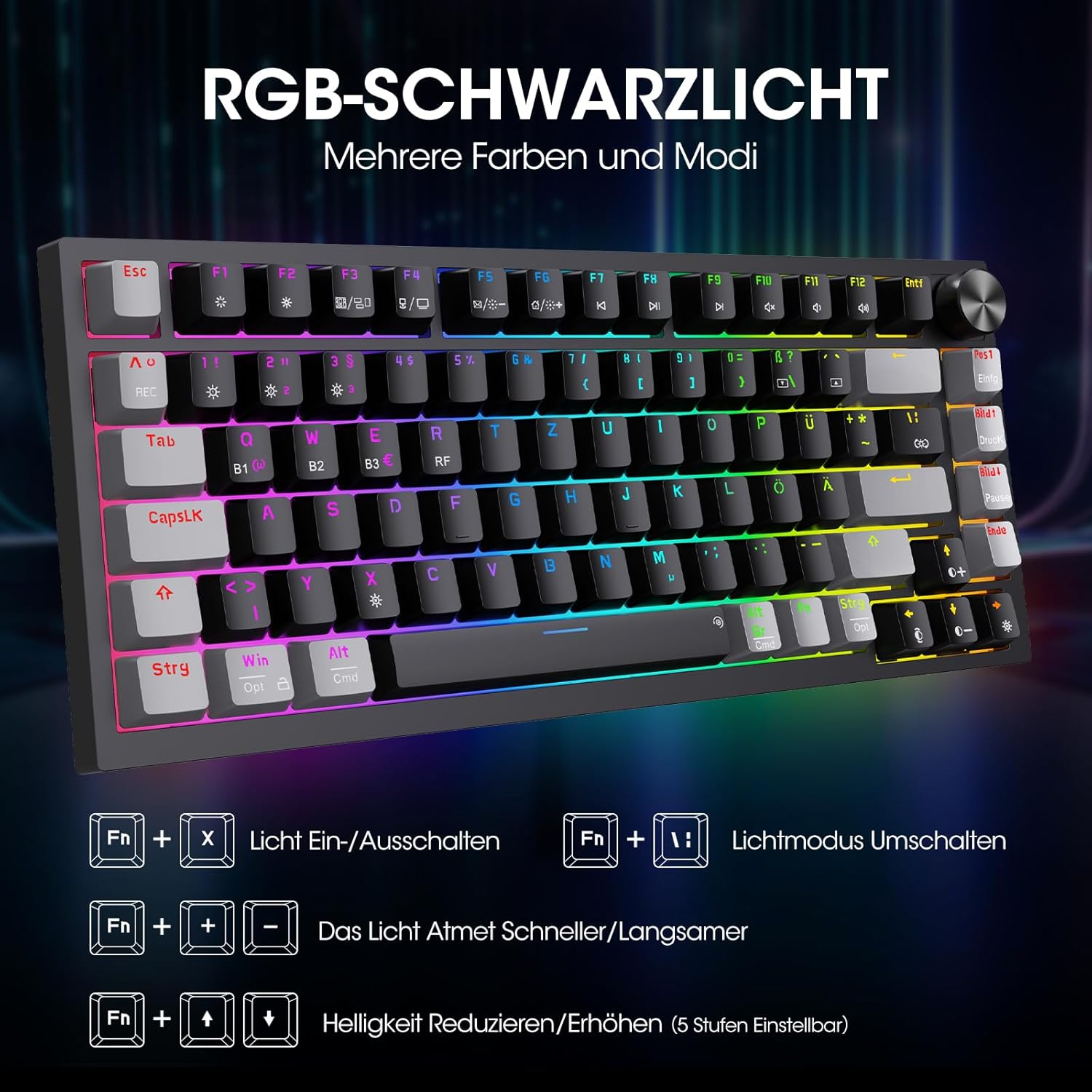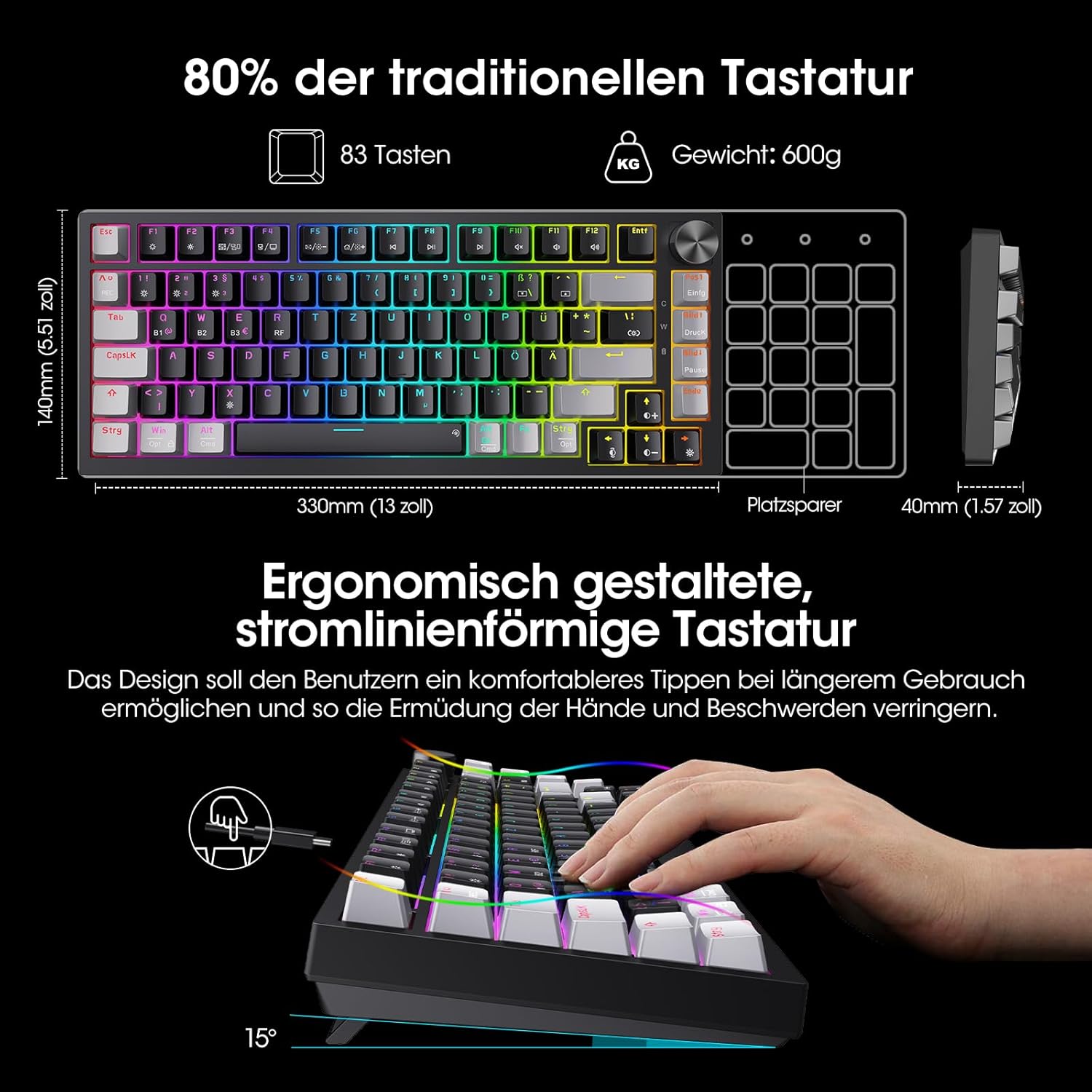 KOORUI Механична клавиатура, Геймърска клавиатура Безжична/Кабелна/Bluetooth 26 RGB Акумулаторна 4000 mAh Батерия 82 Клавиши Немско Разположение QWERTZ за Windows MacOS Linux Червен Switch
