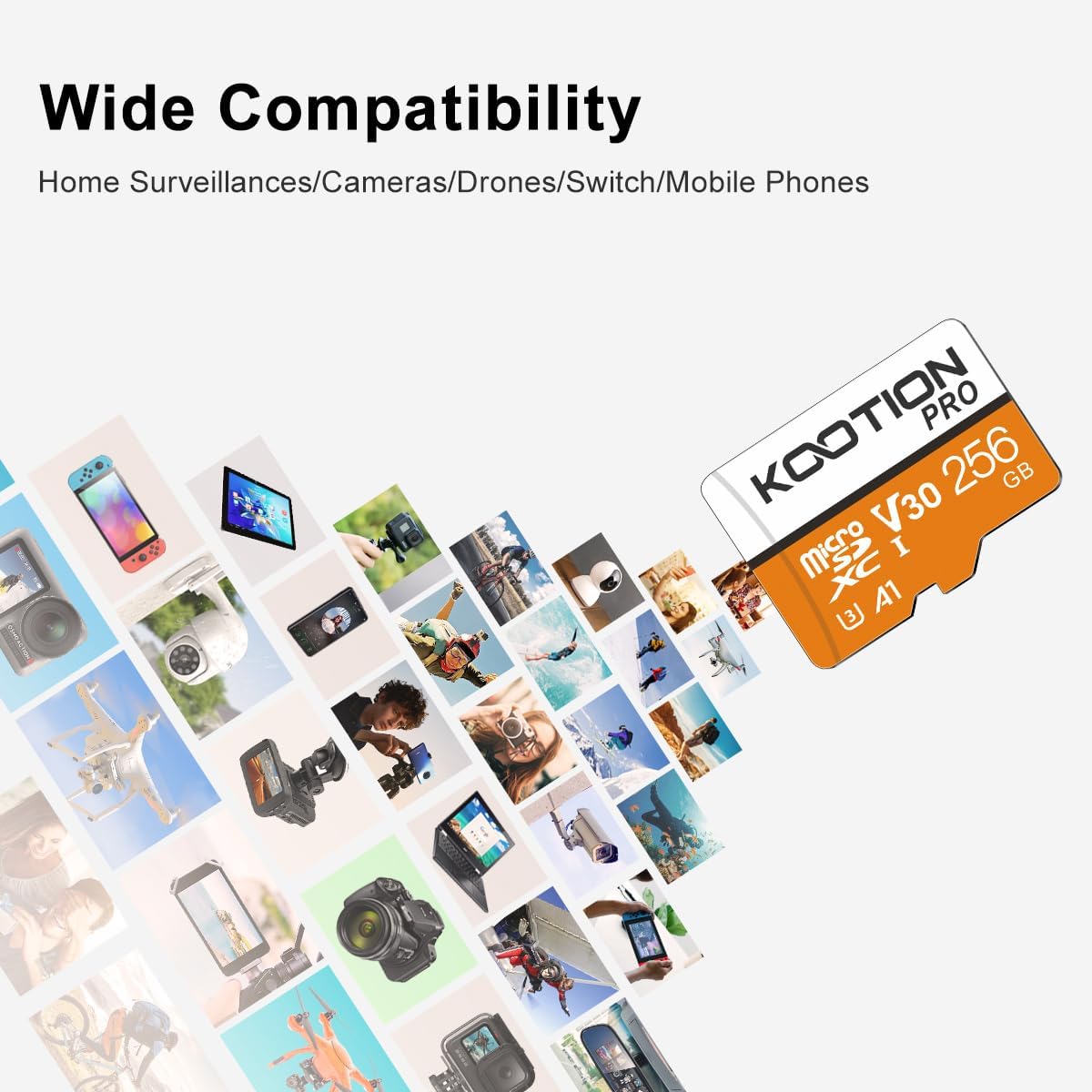 • KOOTION Micro SD картата е идеална за Android смартфони, таблети, цифрови фотоапарати, игрови конзоли, видеорегистратори, дронове и системи за наблюдение и др.