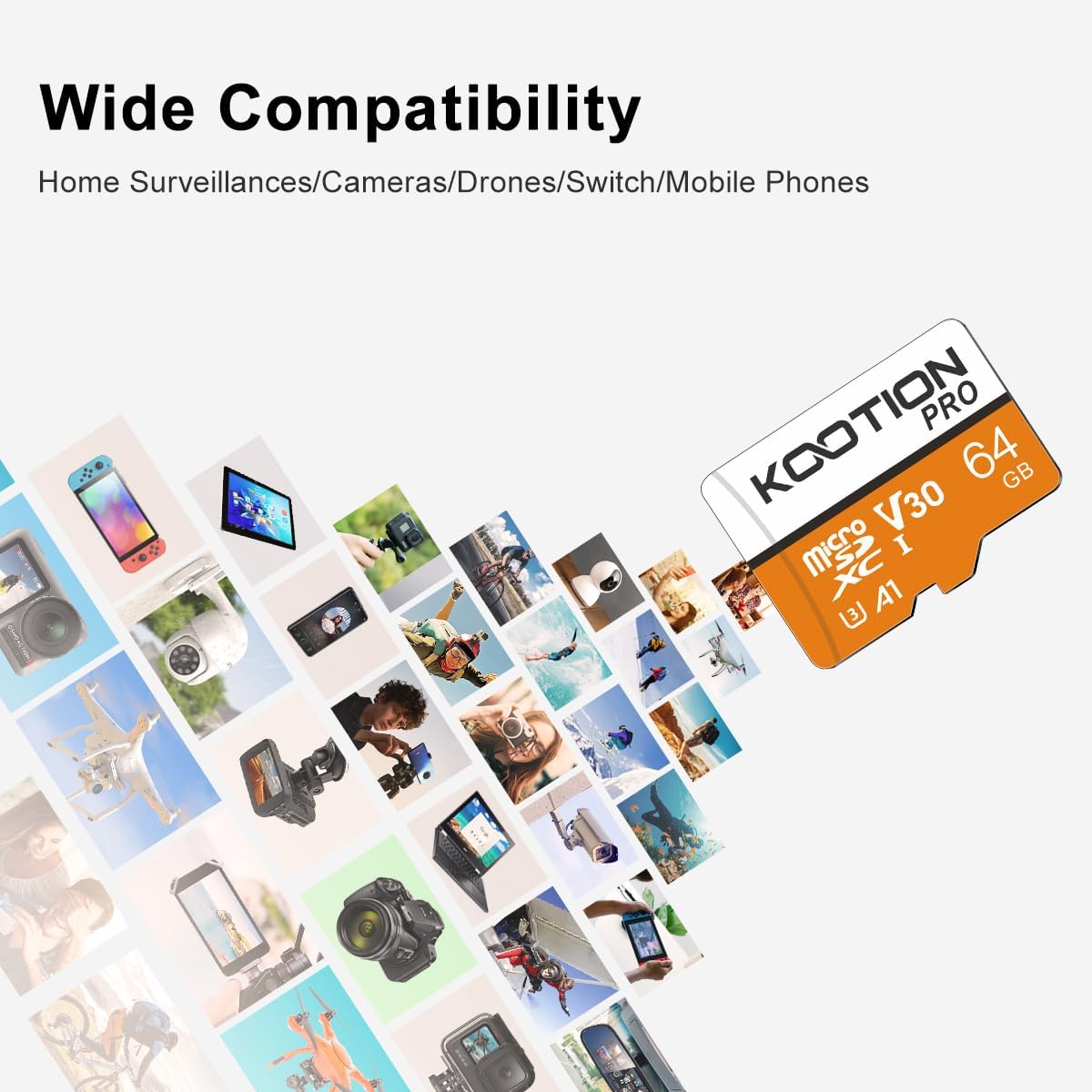 • С картата памет KOOTION 64GB Micro SD, пакет от 5 карти памет 64GB Micro SD, можете да прекарвате часове във Full HD видеоклипове на micro SD картата памет и все още да имате място за видеоклипове, снимки, музика, филми и други файлове, които искате да записвате, съхранявате и споделяте.