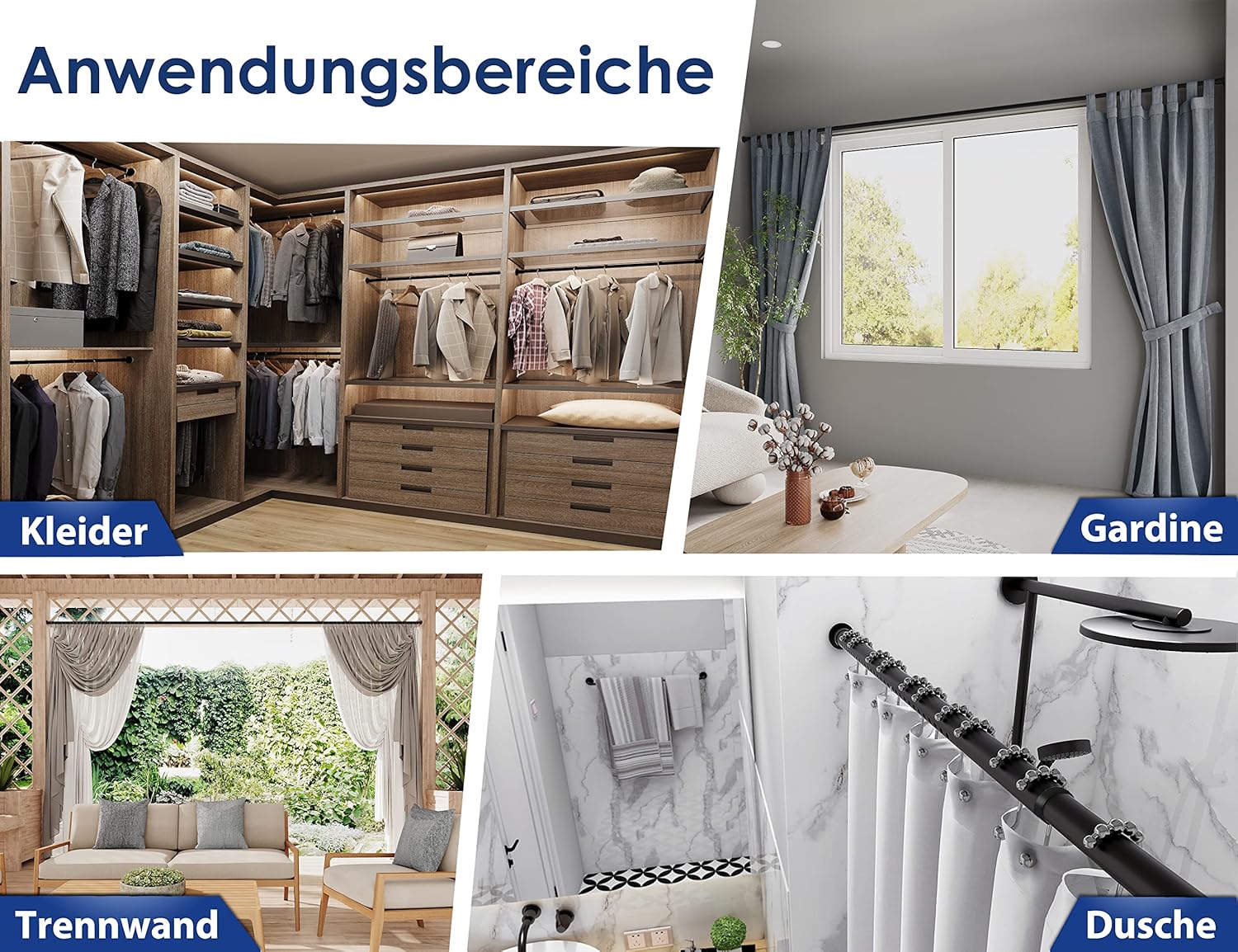 • Лесен монтаж и универсално прилягане: трансформирайте всяка стая за минути с този регулируем прът за опъване без пробиване - не са необходими инструменти. Телескопичният прът за завеси се регулира безпроблемно до желаната дължина и гарантира перфектно прилягане навсякъде, от кухнята до банята. Изпитайте простотата на корниз за завеси без пробиване за бързи и безвредни обновявания.