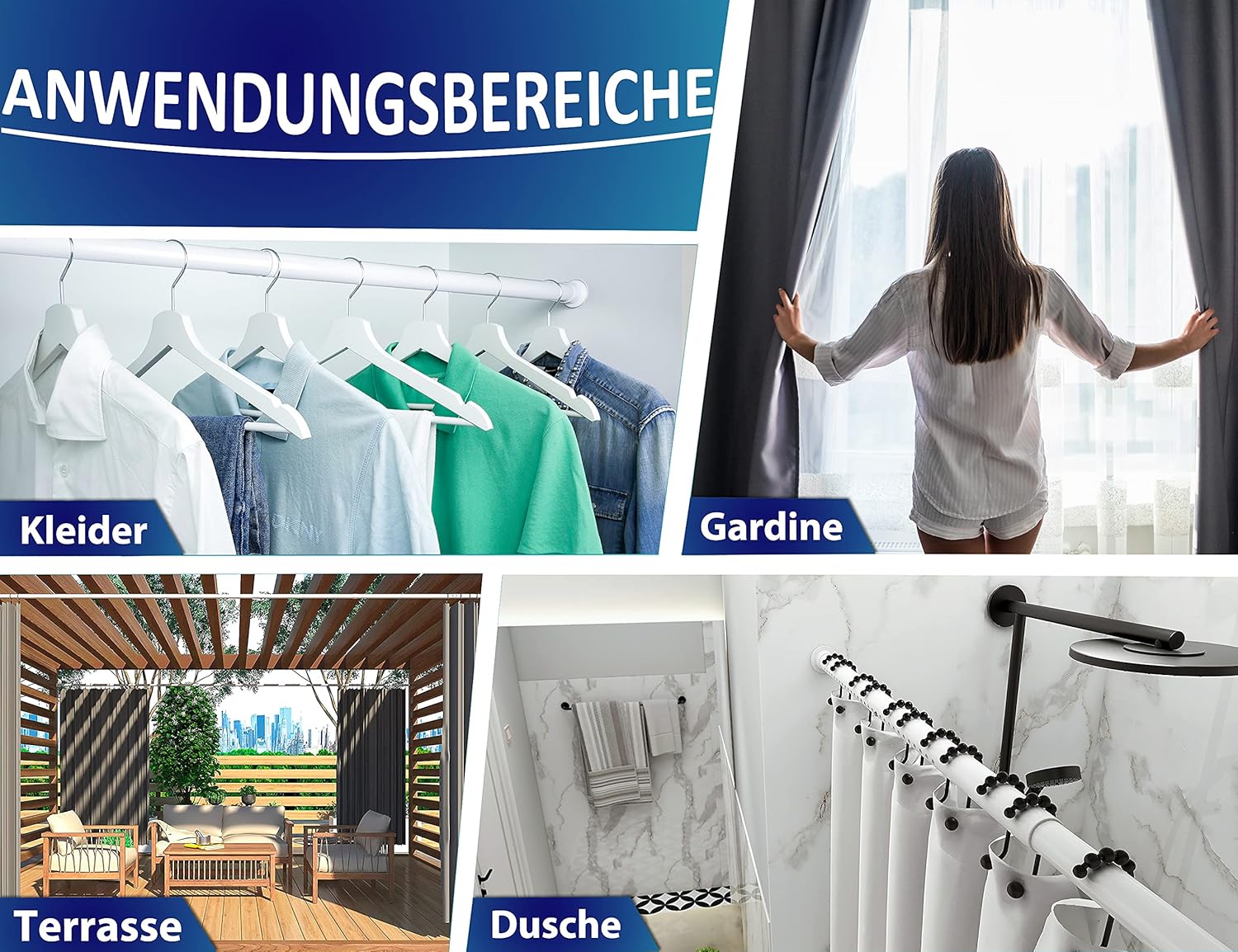• Лесен монтаж и универсално прилягане: трансформирайте всяка стая за минути с този регулируем прът за опъване без пробиване - не са необходими инструменти. Телескопичният прът за завеси се регулира безпроблемно до желаната дължина и гарантира перфектно прилягане навсякъде, от кухнята до банята. Изпитайте простотата на корниз за завеси без пробиване за бързи и безвредни обновявания.
