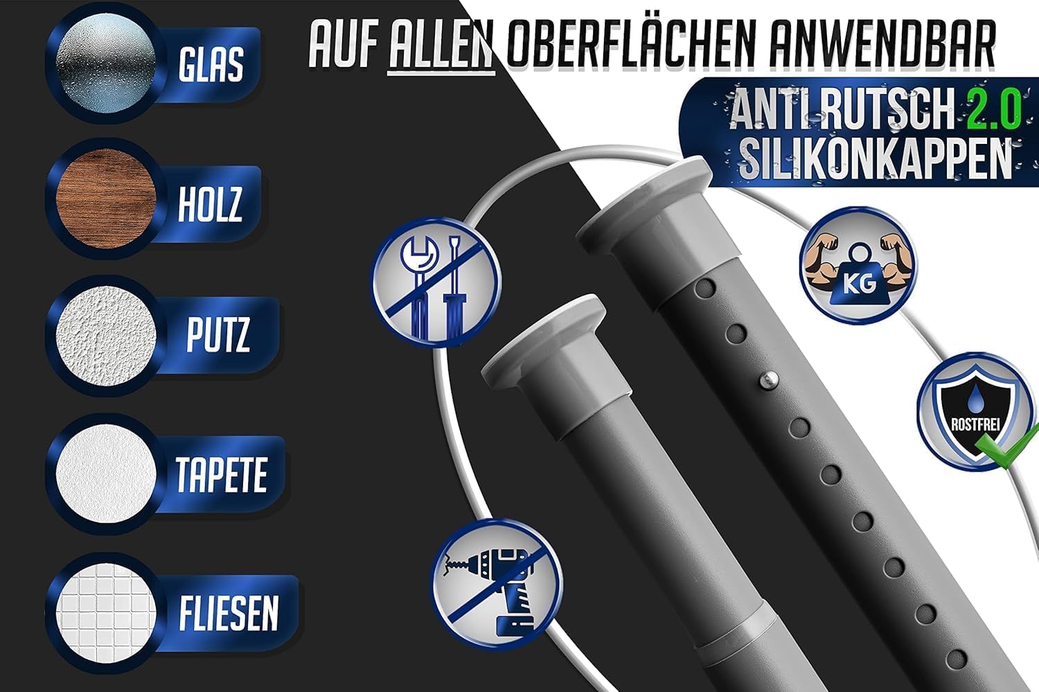 • Стабилност: Останете в безопасност с противоплъзгащи постелки 2.0 и превъзходна конструкция, която гарантира, че вашата завеса ще остане на мястото си на всяка повърхност. Нашият телескопичен прът е изработен от най-съвременни материали за максимална функционалност и издръжливост.