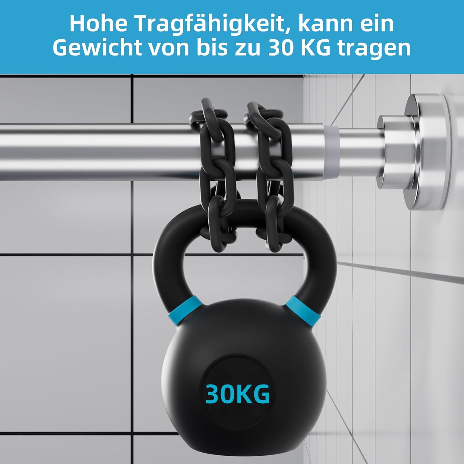 • Здрава и издръжлива: Изработена от висококачествена неръждаема стомана и оборудвана със здрава пружина, тази душова греда издържа до 25 кг. Тя има неплъзгащи се гумени подложки с диаметър 5,5 см в двата края, които осигуряват максимална стабилност и предотвратяват подхлъзване или падане.