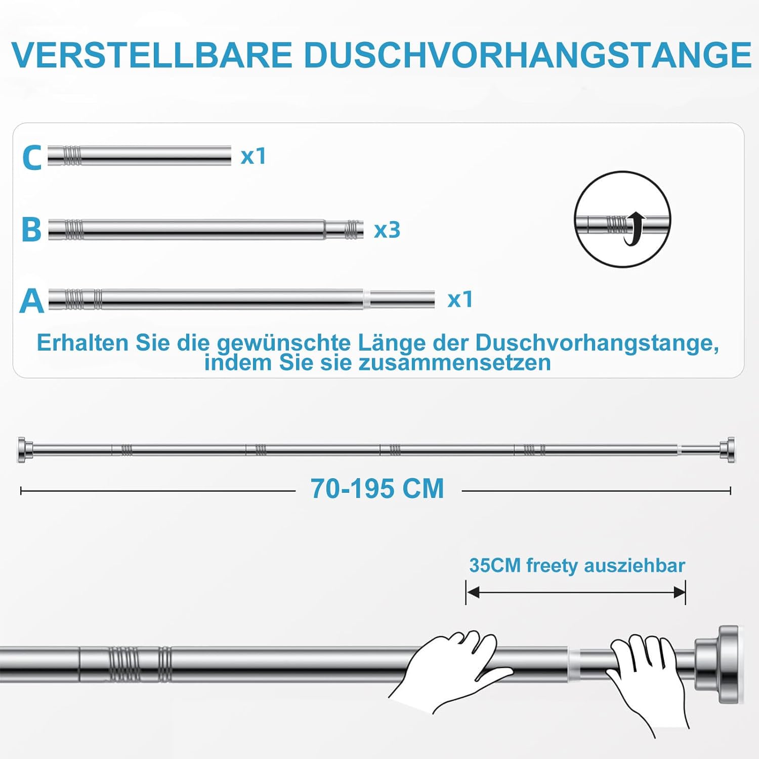 • Регулируем Телескопичният дизайн на този прът за завеса за душ може лесно да се регулира от 70 до 195 см и се адаптира към различни помещения. Регулирайте дължината индивидуално според вашата баня, прозорец, гардероб или други зони.