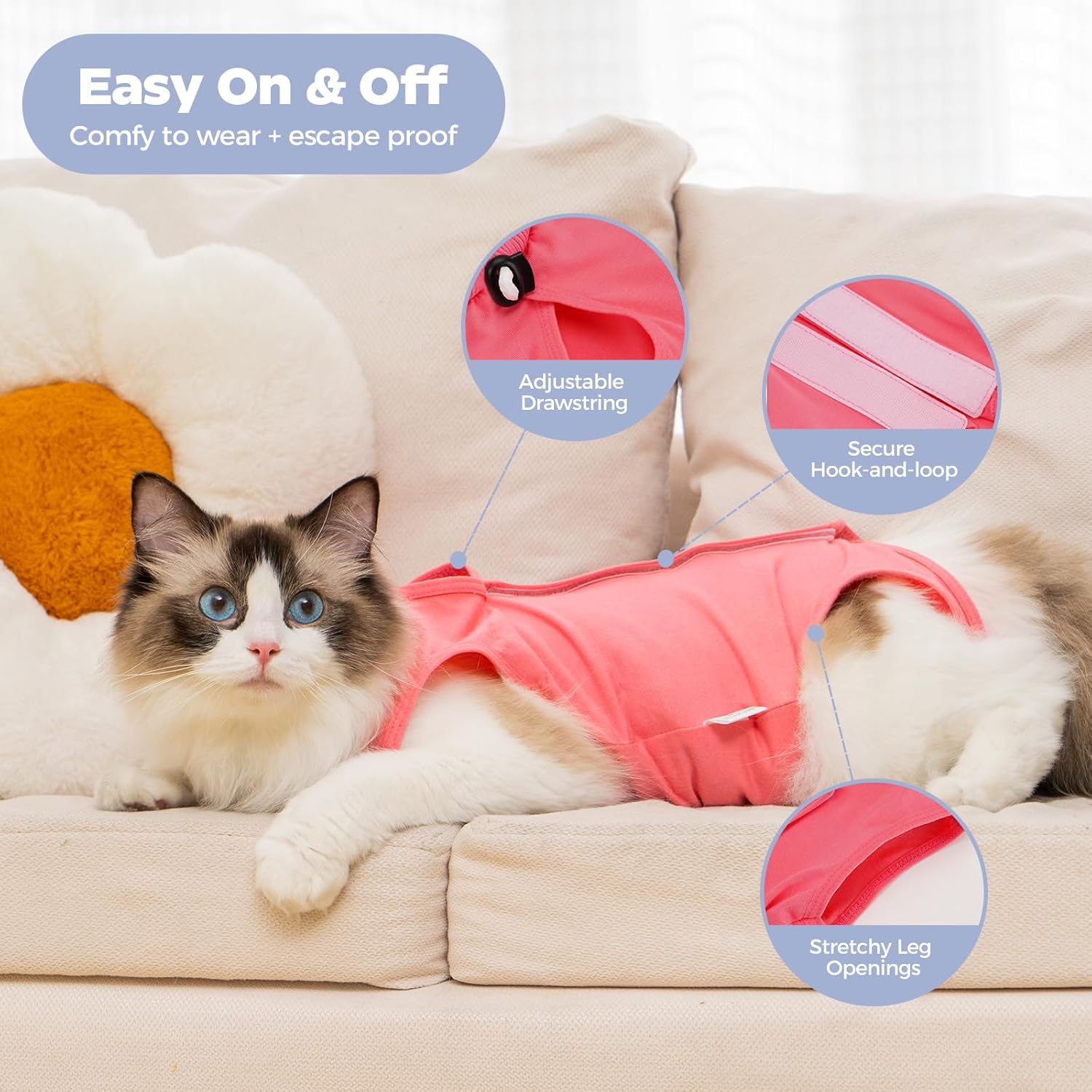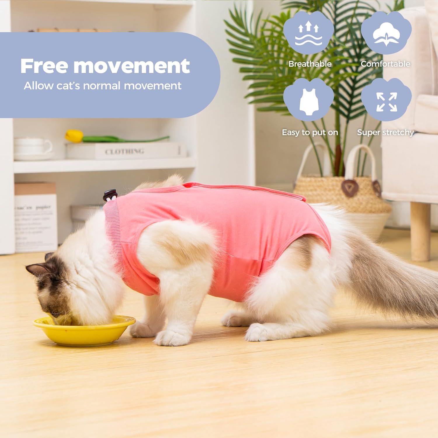 • Дишащ, тънък и мек: модален материал. Тънък, дишащ, мек, еластичен и не влияе на ежедневните дейности на котката. Удобен за носене и насърчава заздравяването и възстановяването. (Моля, позволете на котката да се адаптира към носенето)