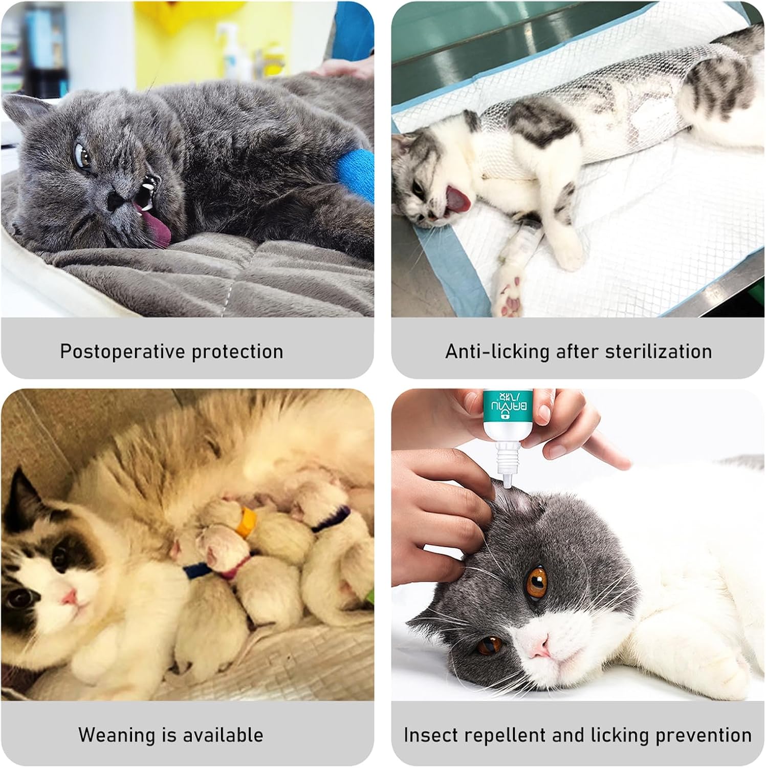 • Широка гама от приложения: Облеклото за възстановяване на котки е професионална алтернатива на конусовидна превръзка и превръзка за цялото тяло. Подходящо е за първа помощ, горещи точки, рани, защита на превръзката, кожни заболявания, топлина, инконтиненция и много други.