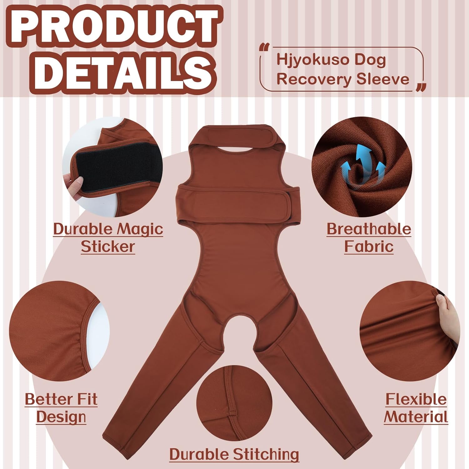 • Основни характеристики: Изработени от висококачествена материя: дишаща, хипоалергенна и переща се. Ръкав за защита на ханша и бедрата за следоперативни кучета: включва левия и десния заден крак. Регулируемите велкро ленти около врата и корема осигуряват сигурно прилягане. Не е необходимо да се сваля за тоалетна. Предлагат се в 7 размера.