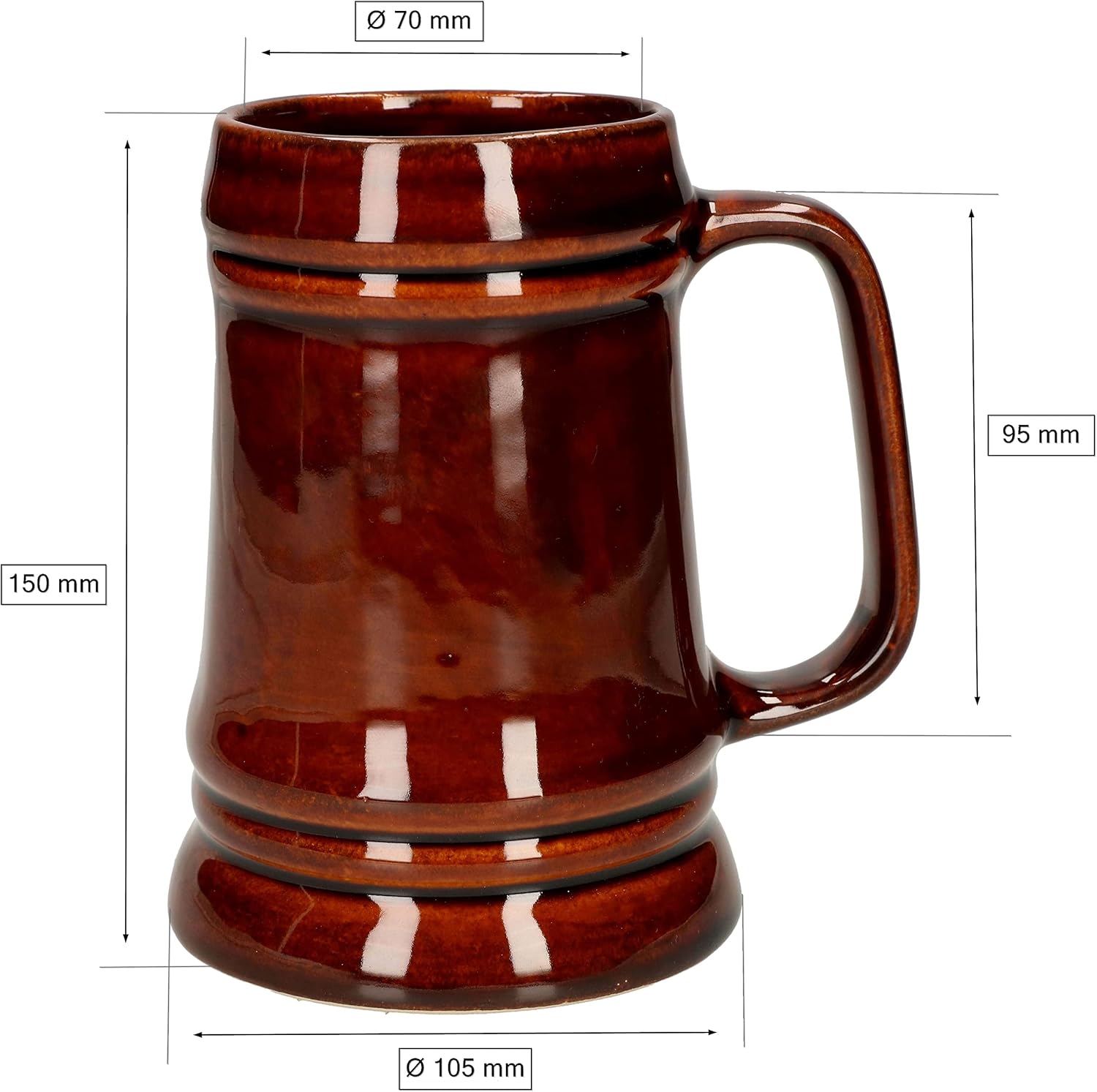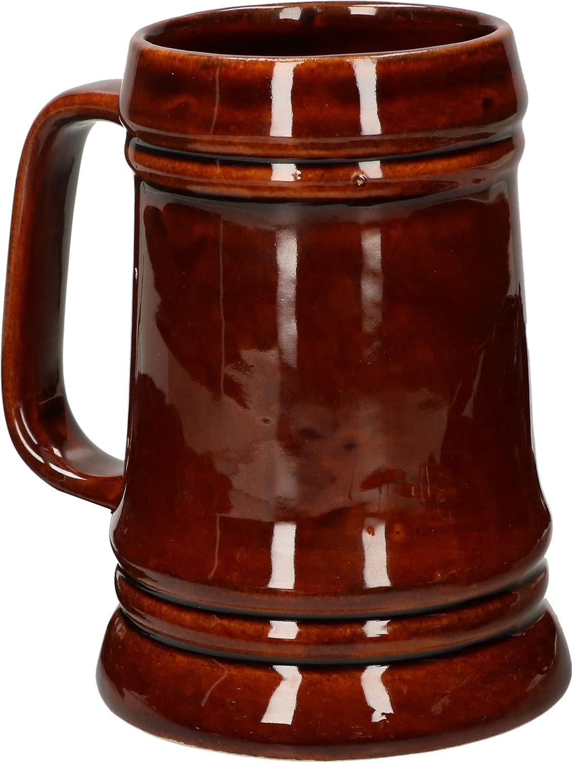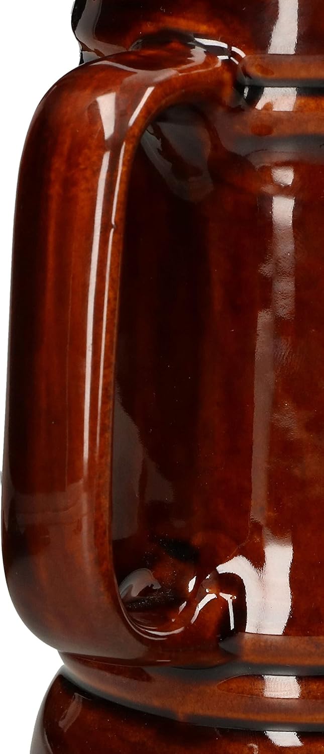 • ТЕХНИЧЕСКИ ДАННИ - Халба за бира 0.5 л - Височина: 150 мм, Диаметър на основата: 105 мм, Диаметър: 70 мм, Дължина на дръжката: 95 мм, Материал: Керамика, Тегло: 582 г, Вместимост: 0.5 л, Цвят: Кафяв